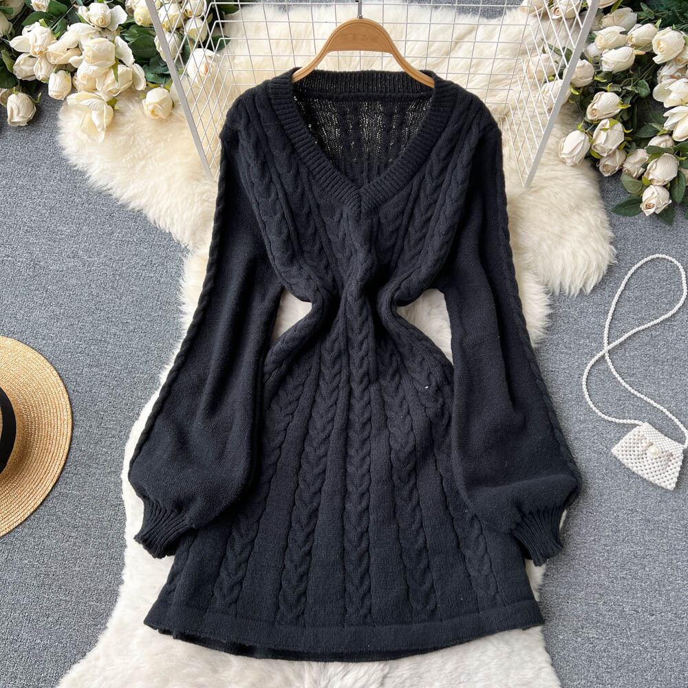 style シックな秋冬レトロ麻柄Vネックウエストデザイン提灯袖Aラインニットセーターワンピース ランタンスリーブ オータム 秋物 ウィンター 冬物 lyxaj18063804950