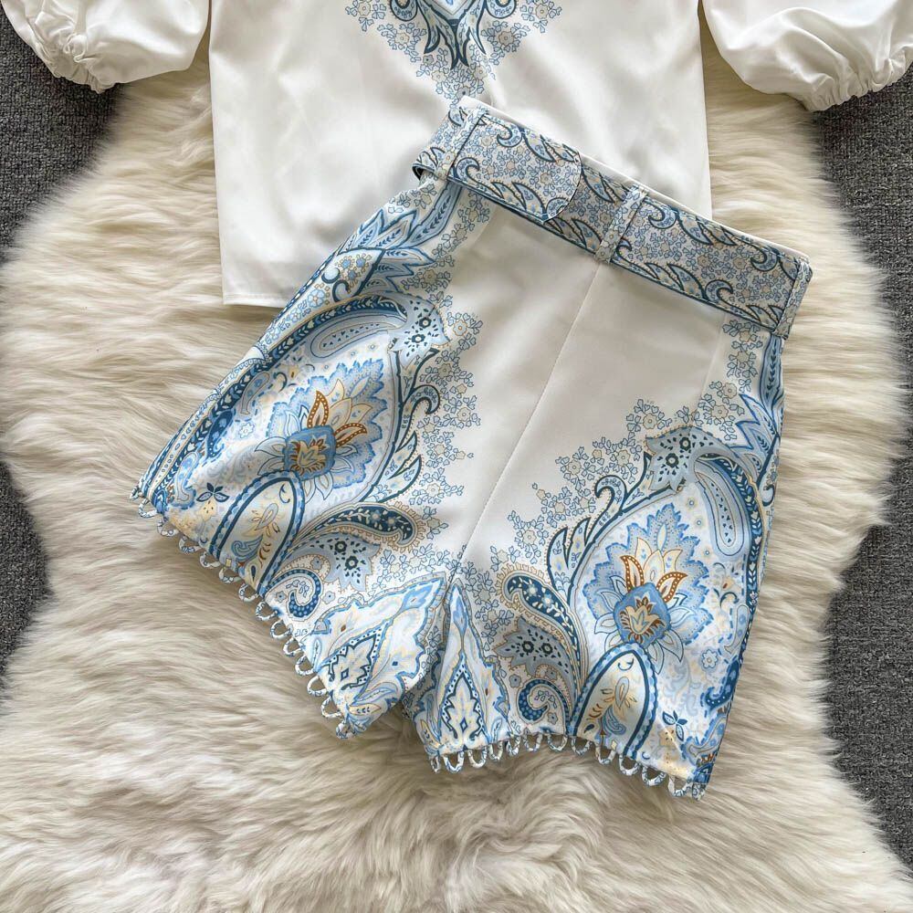 春夏レトロコートスタイルプリントスーツレディースランタンスリーブスタンドカラートップ+ハイウエストワイドレッグショーツ2点セット ハイウェスト スプリング 春物 サマー 夏物 ブルマー ワイドパンツ lyxaj41599686855