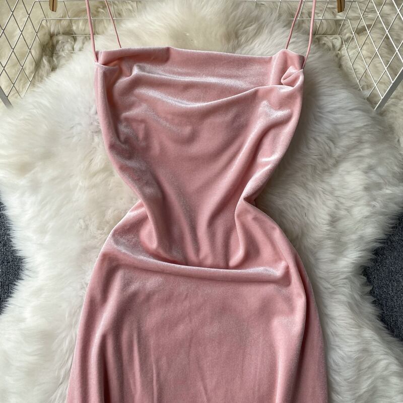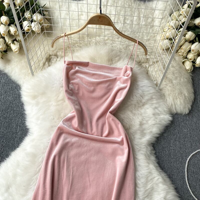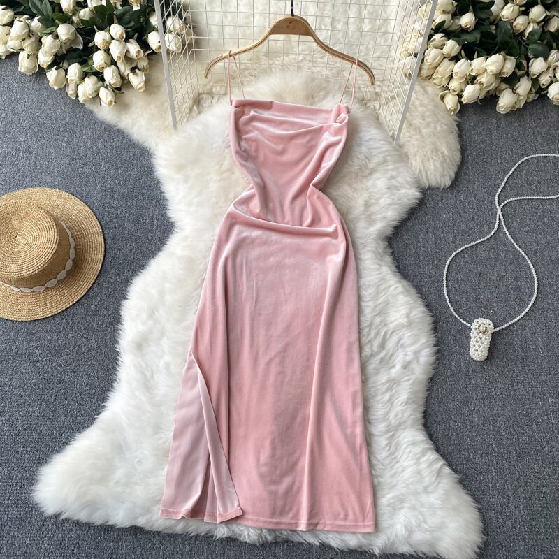 純粋な欲望春と秋の新しいノースリーブ サスペンダー ハイ ウエスト スリット セクシー ドレス女性ベルベット ライトおなじみ風ロング スカート ハイウェスト スプリング 春物 オータム 秋物 lyxaj40383261099