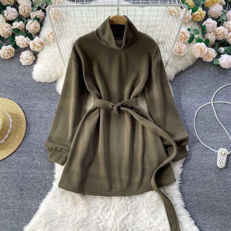 ヨーロッパとアメリカの無地ハイカラー長袖セータードレス女性の秋と冬の新しいミッドレングスウエストウエストタイカジュアル A ラインスカート ロング オータム 秋物 ウィンター 冬物 Aライン ソリッドカラー ヨーロピアン lyxaj32881464862