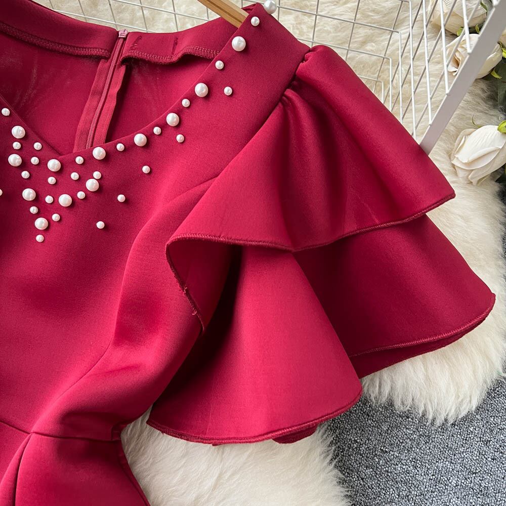 夏の新デザインセンスパールバージョンVネックファッション気質エレガントウエストセクシーレディスリットドレス サマー 夏物 真珠 lyxaj91073194583