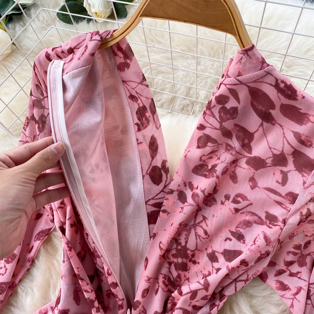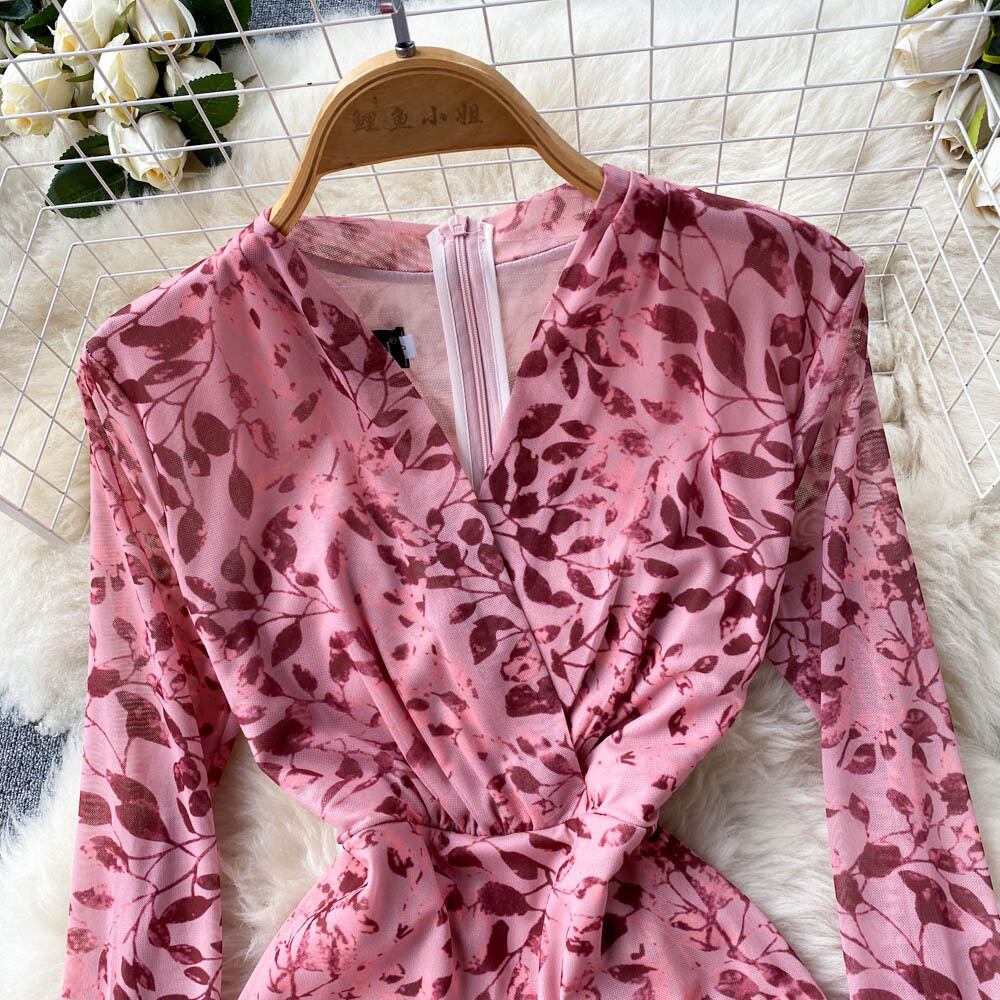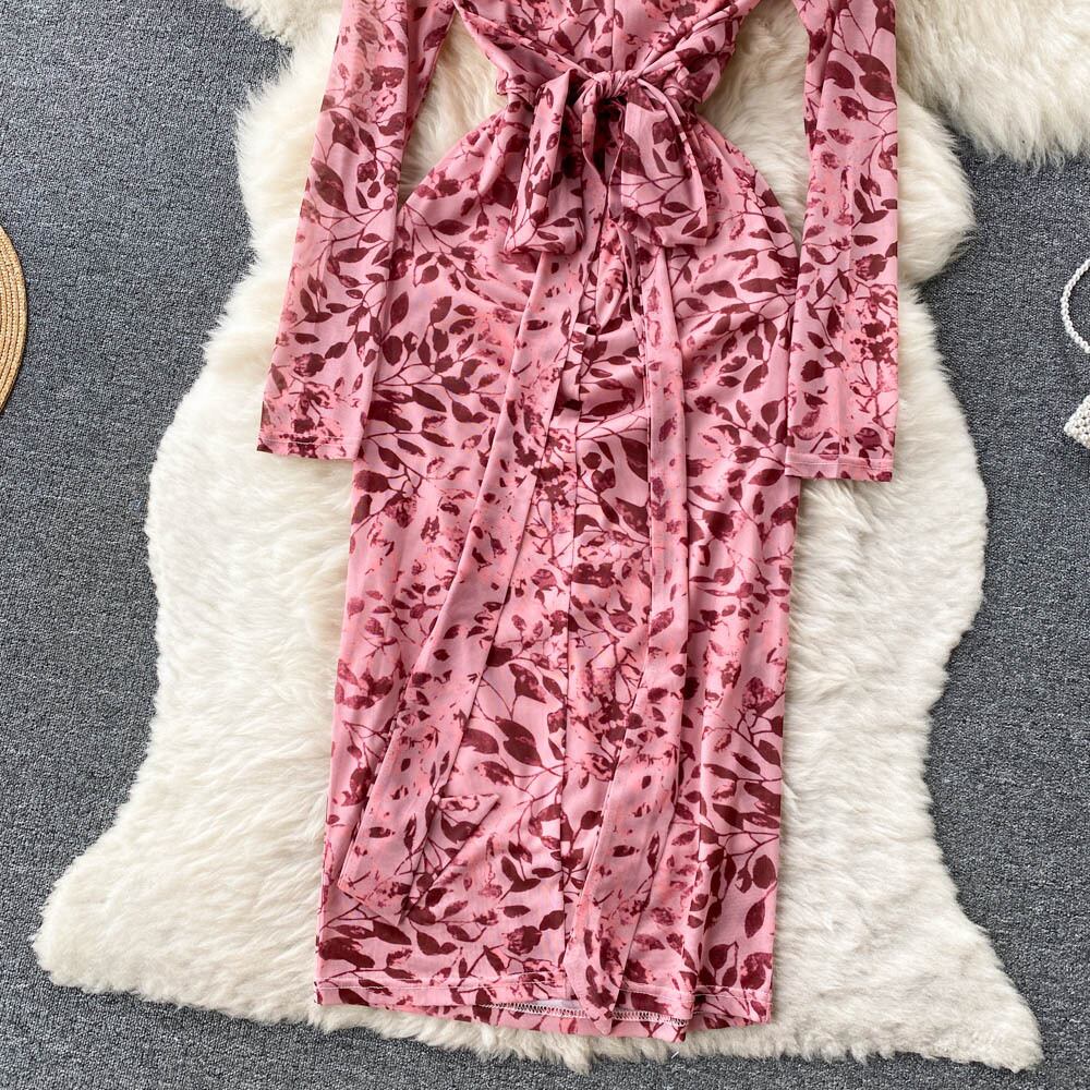 軽くて馴染みやすい風タイウエスト痩身Vネックワンピース夏らしいレディースシックで綺麗めな長袖花柄ワンピ ロング サマー 夏物 lyxaj43406969319