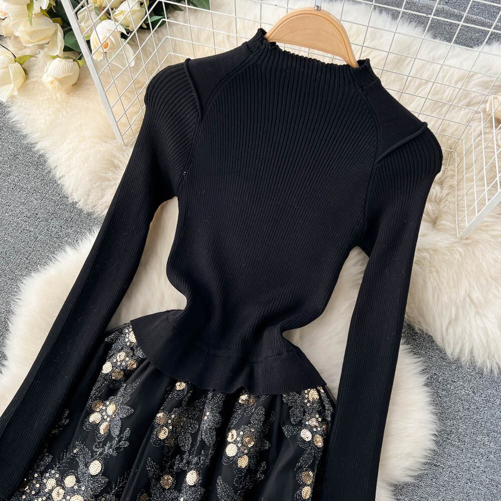 秋と冬の新しい重工業スパンコール刺繍長袖ラウンド ネック ニット ステッチ ファッション スリム フレンチ ドレス ロング オータム 秋物 ウィンター 冬物 Oネック lyxaj23918820883