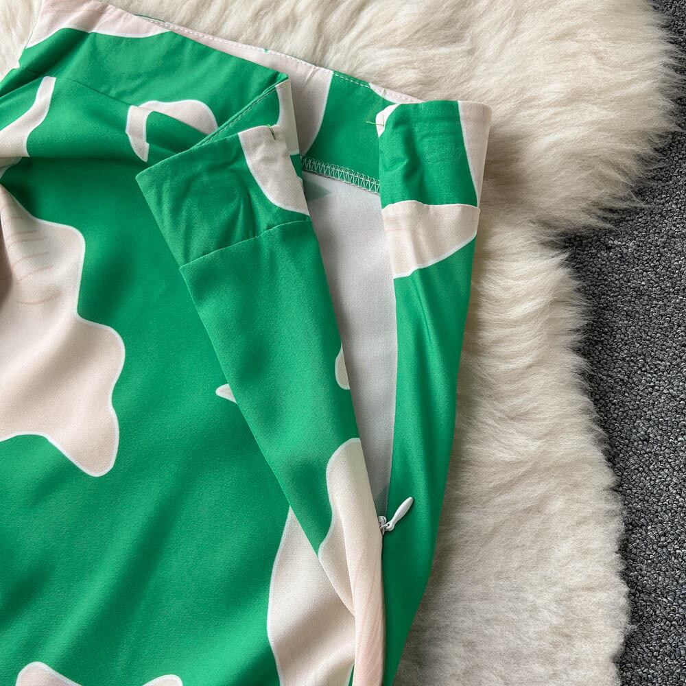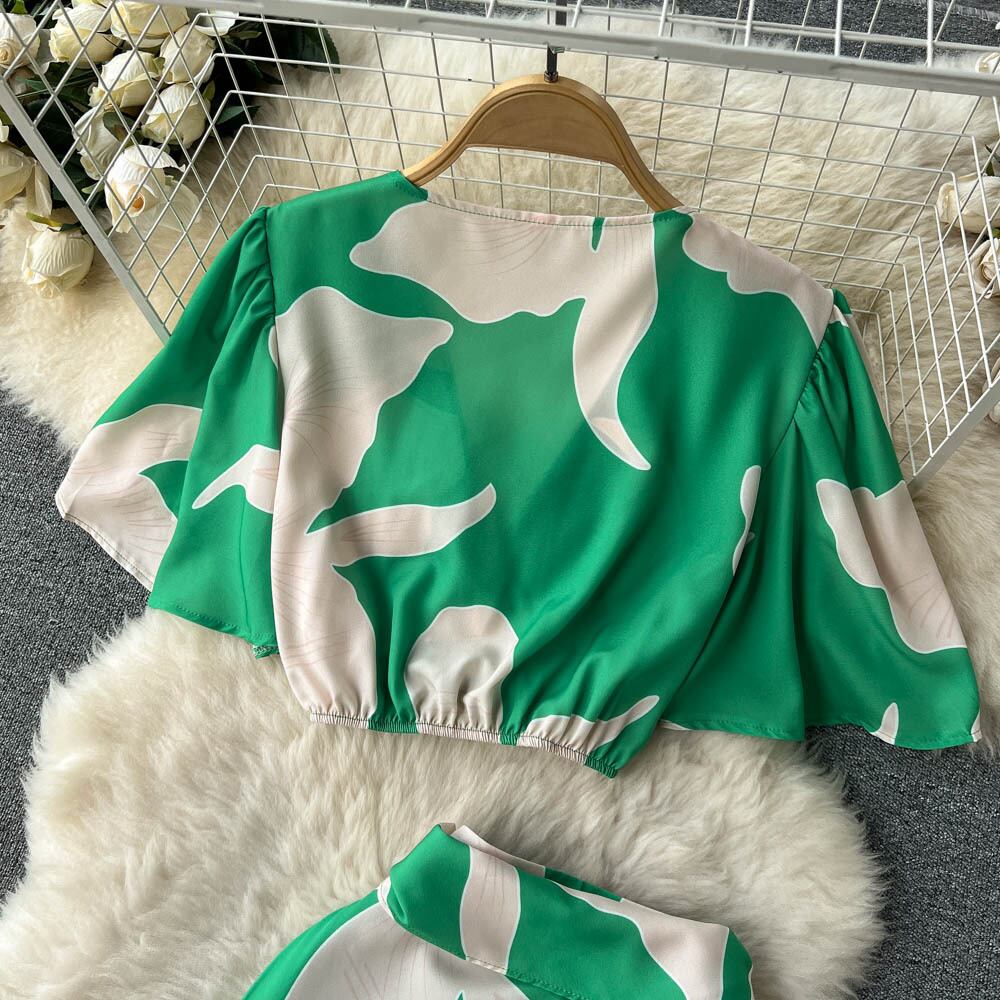 春夏秋冬風プリントスーツレディースショートVネックフライングスリーブトップ+イレギュラーストラップスカート2点セット スプリング 春物 サマー 夏物 lyxaj91922890024