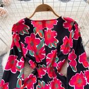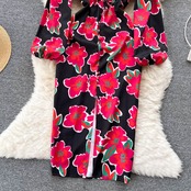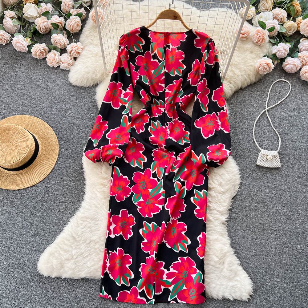秋冬のハイエンドフェミニンなプリントドレスVネックスリムスリムミッドレングスバッグヒップウエストスリットスカート オータム 秋物 ウィンター 冬物 lyxaj667856433