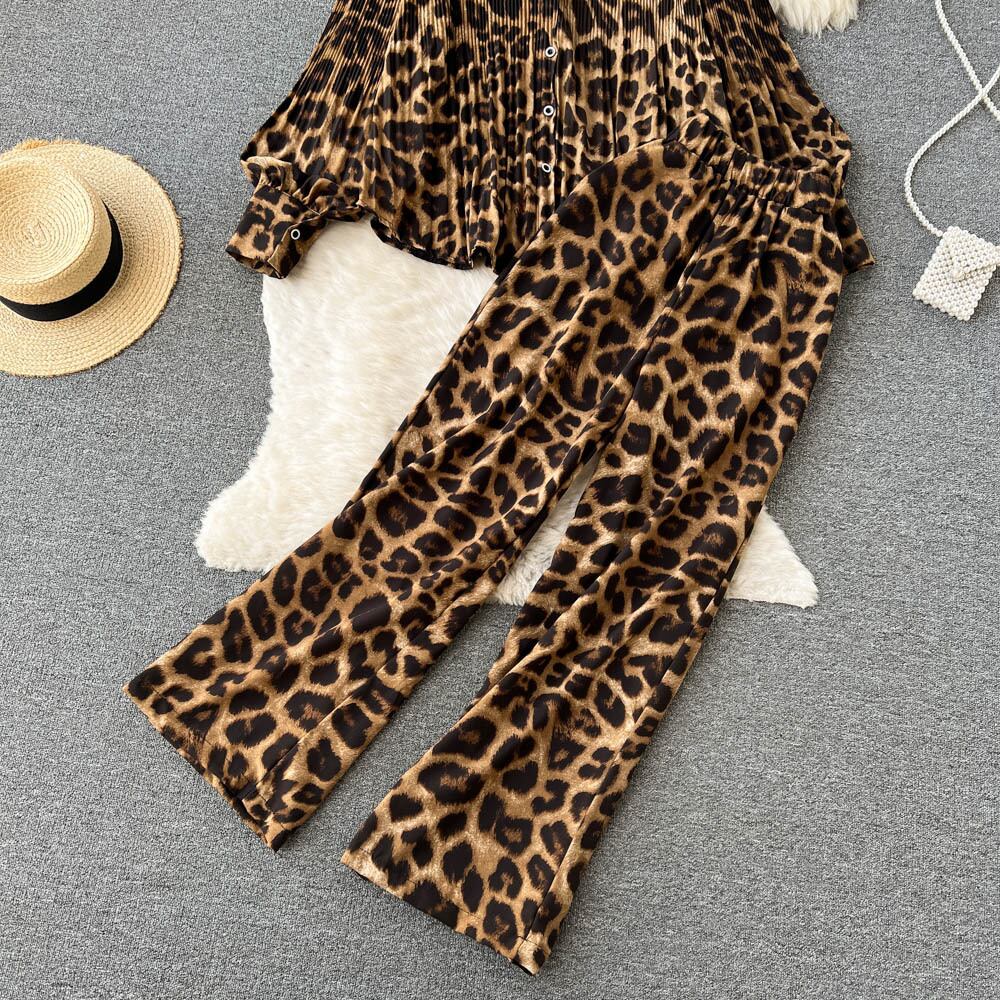 ヒョウ柄インスタイルカジュアルスーツレディースルーズプリーツラペルシャツ+ドレープワイドレッグロングパンツ2点セット lyxaj19281377793