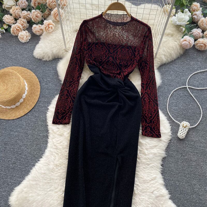 スパイスガールメッシュ中空エア長袖ドレス秋の女装ヘップバーンスタイルスリムウエストスリムパッケージヒップリトルブラックドレス ロング オータム 秋物 lyxaj7772005530