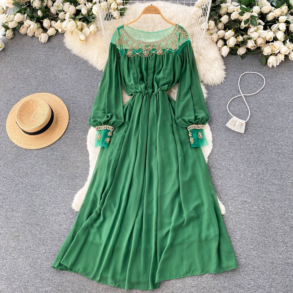 フレンチスタイルのハイエンドビーズラウンドネックドレス夏の女性の軽くて馴染みやすい風ウエスト痩身ブルーAラインドレス サマー 夏物 Oネック lyxaj61792822122