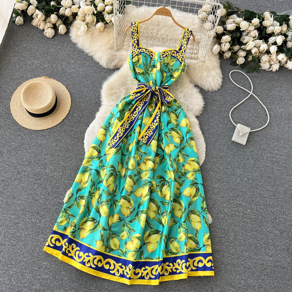 ヨーロッパとアメリカのレトロな印刷裁判所スタイルの蝶ネクタイ緩いノースリーブ ベスト a ライン ストラップ ドレス女性 リボン Aライン ヨーロピアン lyxaj54226518652