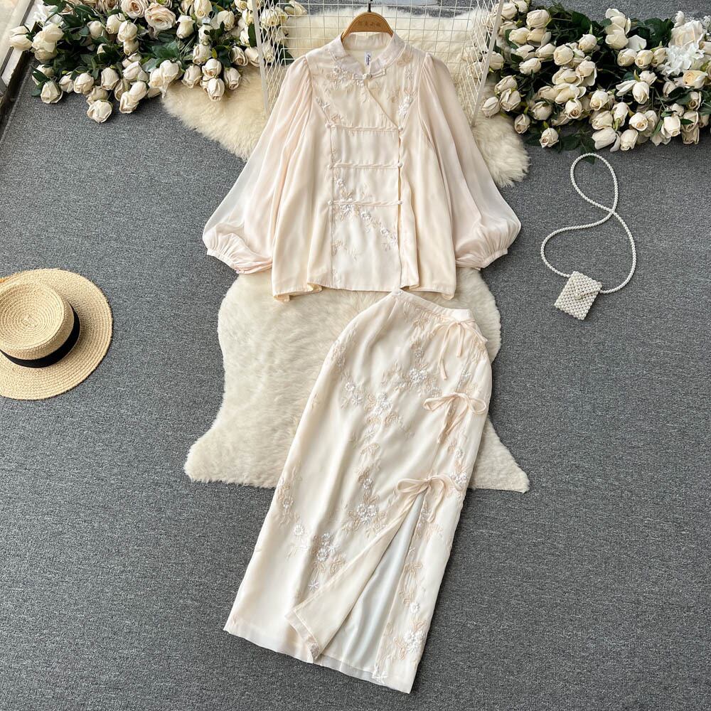 春秋新作中国風スーツレディーススタンドカラーパフスリーブボタン刺繍シャツ+スリットバッグヒップスカート2点セット スプリング 春物 オータム 秋物 lyxaj10247330306