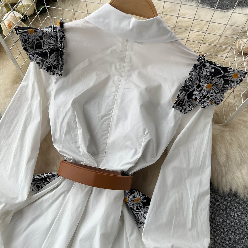 フレンチスタイルの小さな香りのスタイルレディースハイエンドフリルリーフエッジフェイクツーピースミドルレングス刺繍プリントステッチシャツドレス lyxaj58050479239