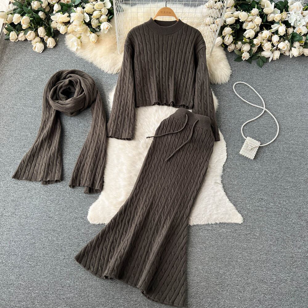 ese レトロ風ニットツイストスーツ レディース ショートセーター+ミドルロングフィッシュテールスカート+マフラーの3点セット lyxaj10677210737