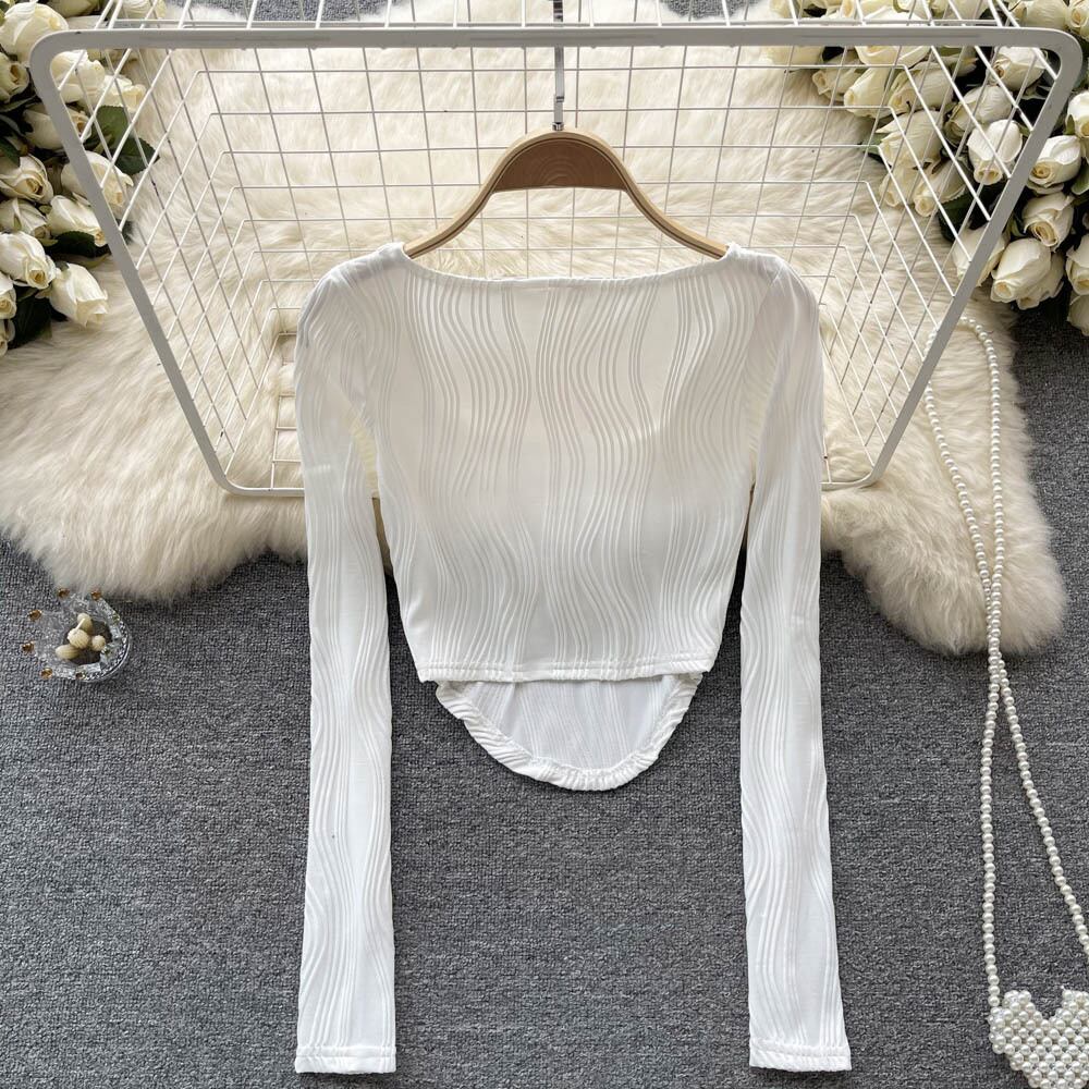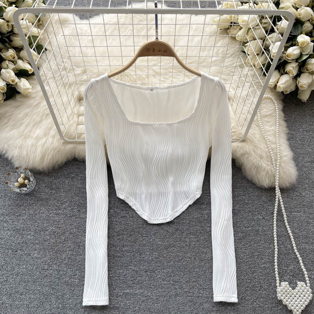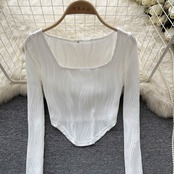 ヨーロッパとアメリカのスタイルのイン不規則なテクスチャーのスクエアカラーの無地の長袖Tシャツの女性は、内側と外側に薄い短いトップを着ています ショート ロング ソリッドカラー スクウェア ヨーロピアン lyxaj18447446600