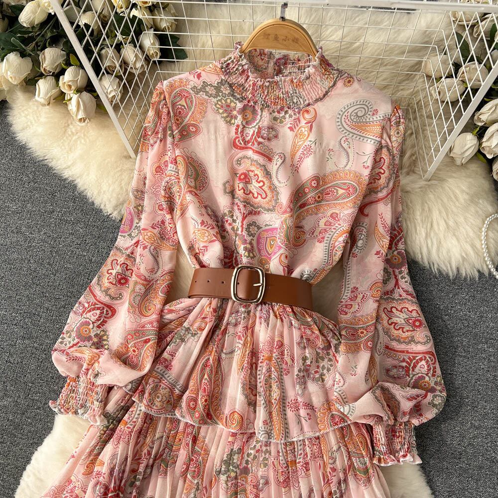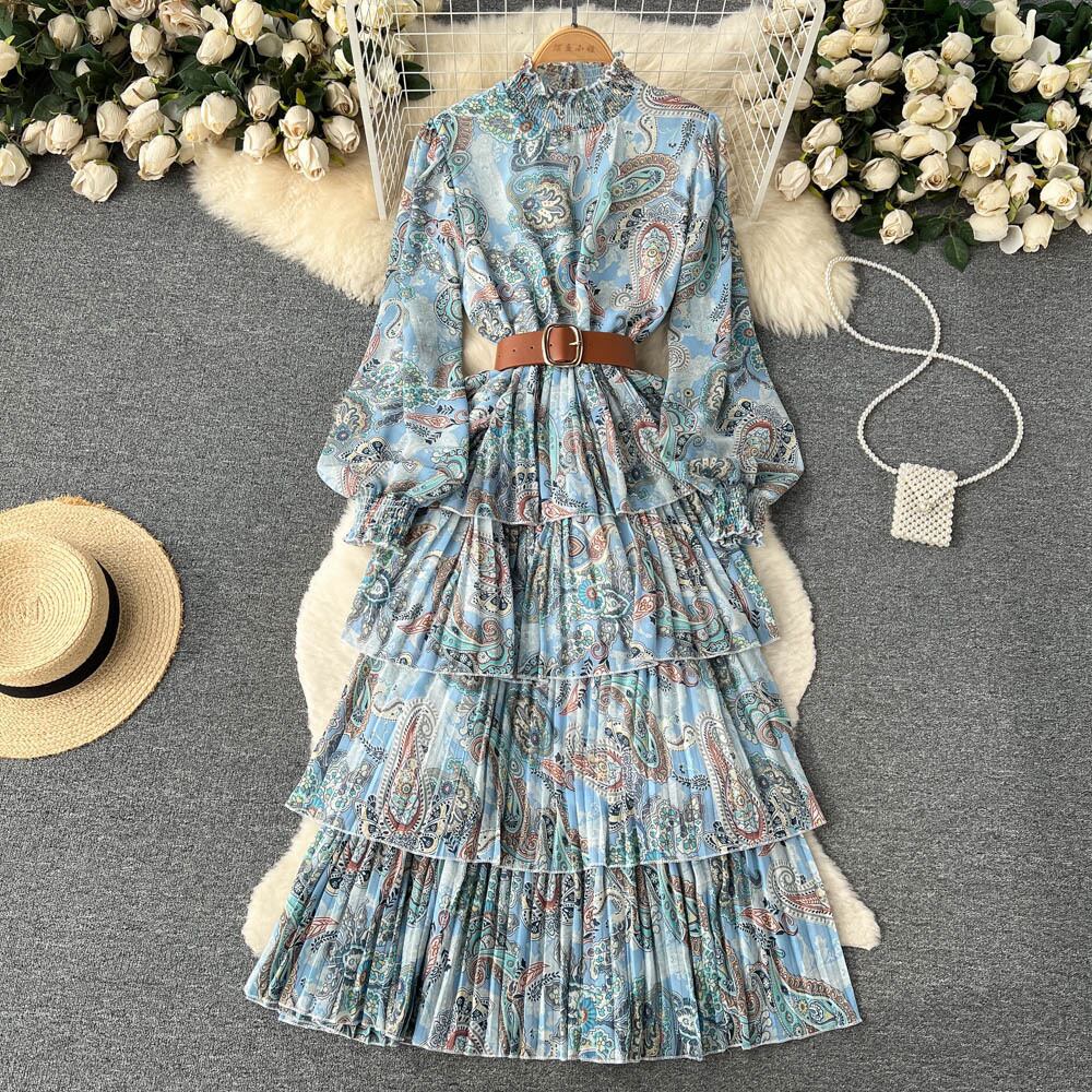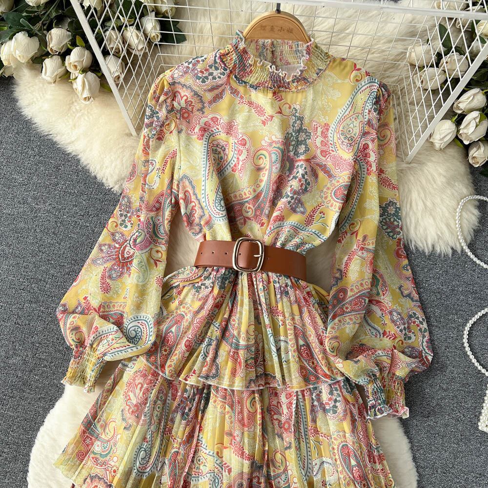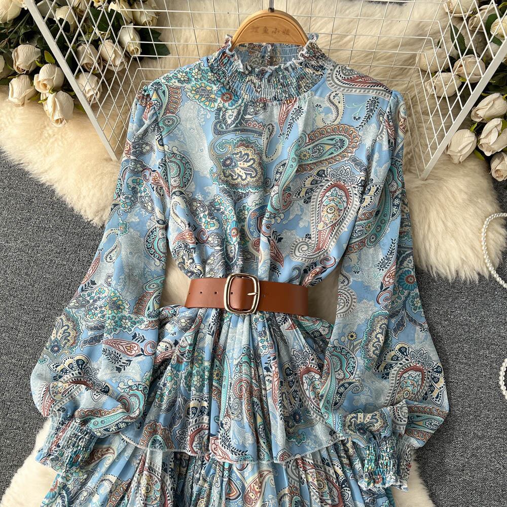 スタンドカラー メッシュ 長袖 フリル プリントウエスト ふんわりドレス レディース 春秋 ランタンスリーブ ケーキドレス ロング ラッフル ふわふわ スプリング 春物 オータム 秋物 lyxaj30132659469
