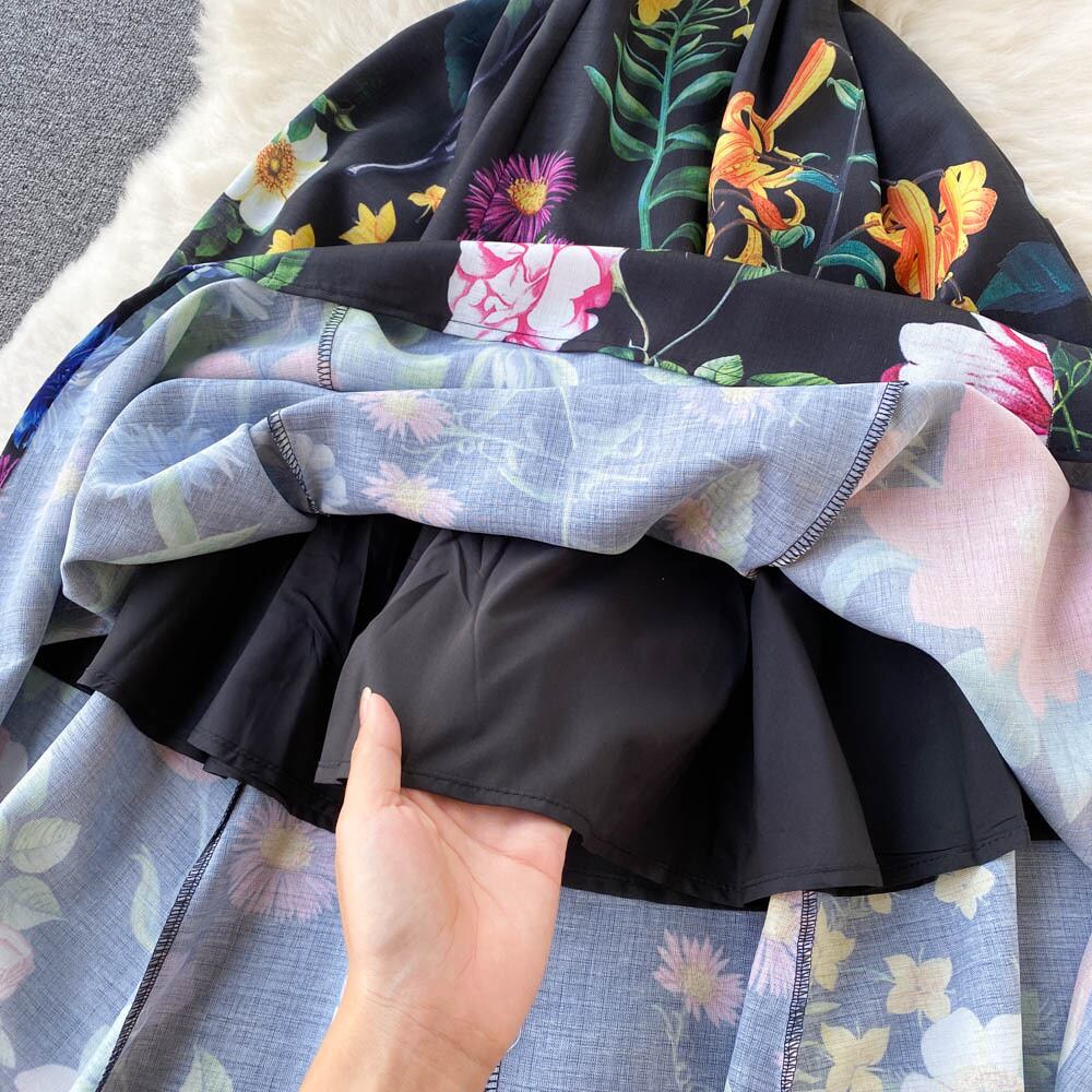 フランスのレトロなウエスト スリム ベスト ドレス夏の女性の海辺の休暇プリント気質 A ライン ロング スカート サマー 夏物 Aライン lyxaj88899982788