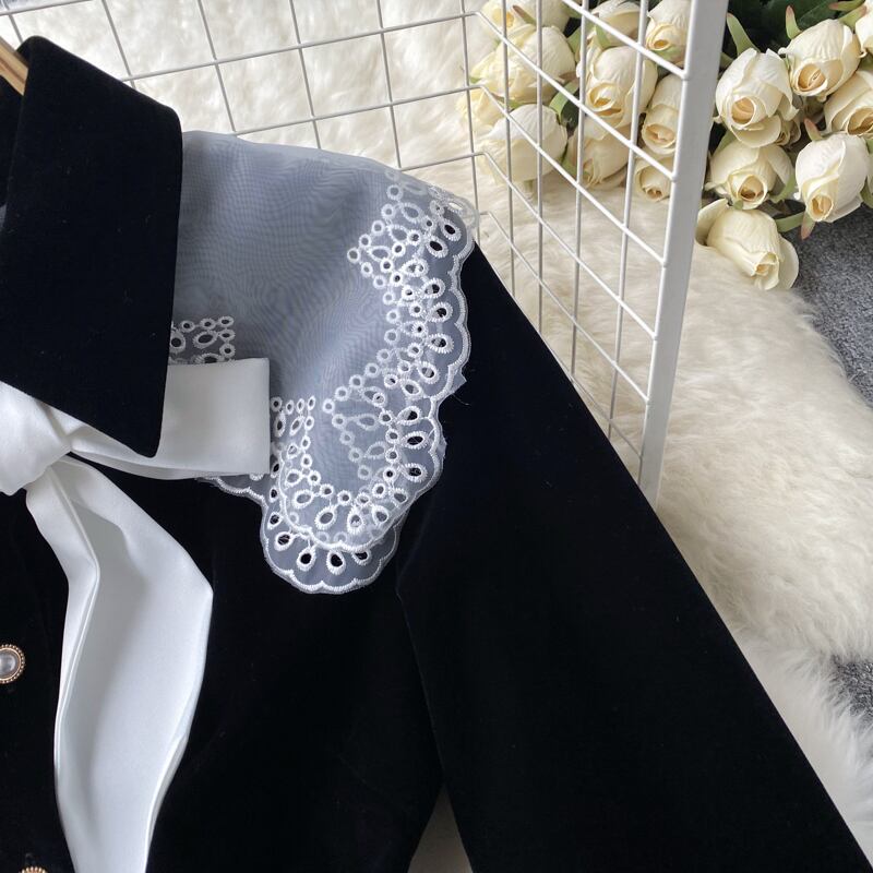 秋と冬のちょう結びレースネイビーカラーフレンチシングルブレストベルベットドレス女性のAラインプリンセスドレスリトルブラックドレス リボン オータム 秋物 ウィンター 冬物 lyxaj73533838675