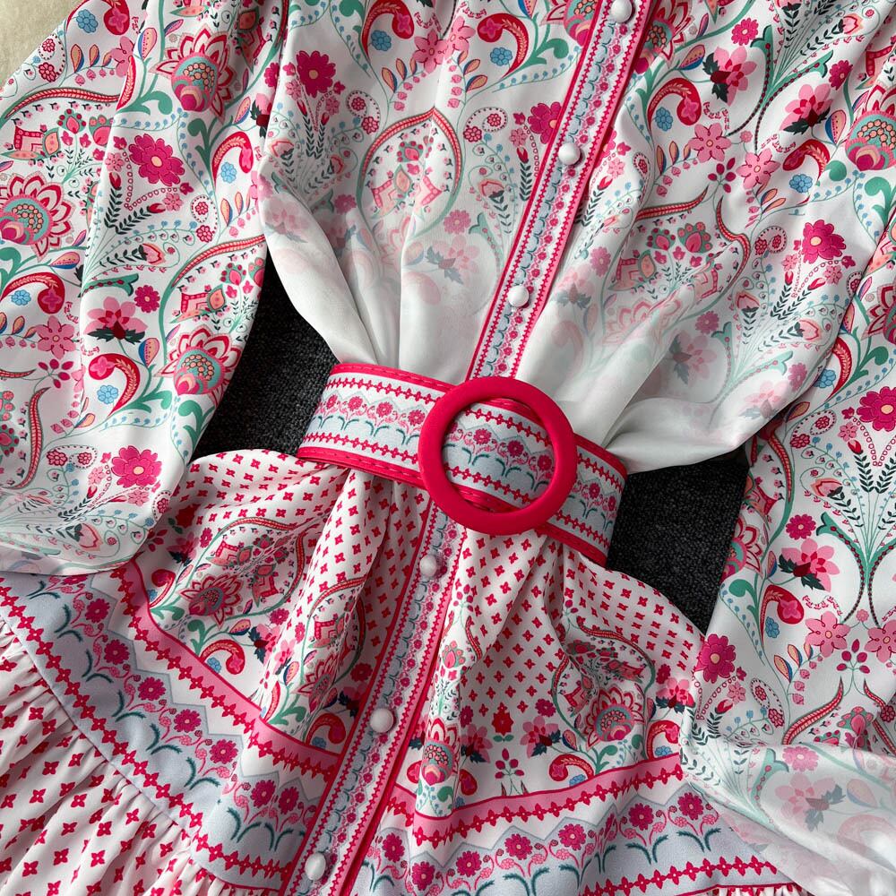 春の新作レトロパレス風スタンドカラーシングルブレストボタンランタンスリーブウエスト痩身ミドル丈フリルドレス レース スプリング 春物 lyxaj87452010938