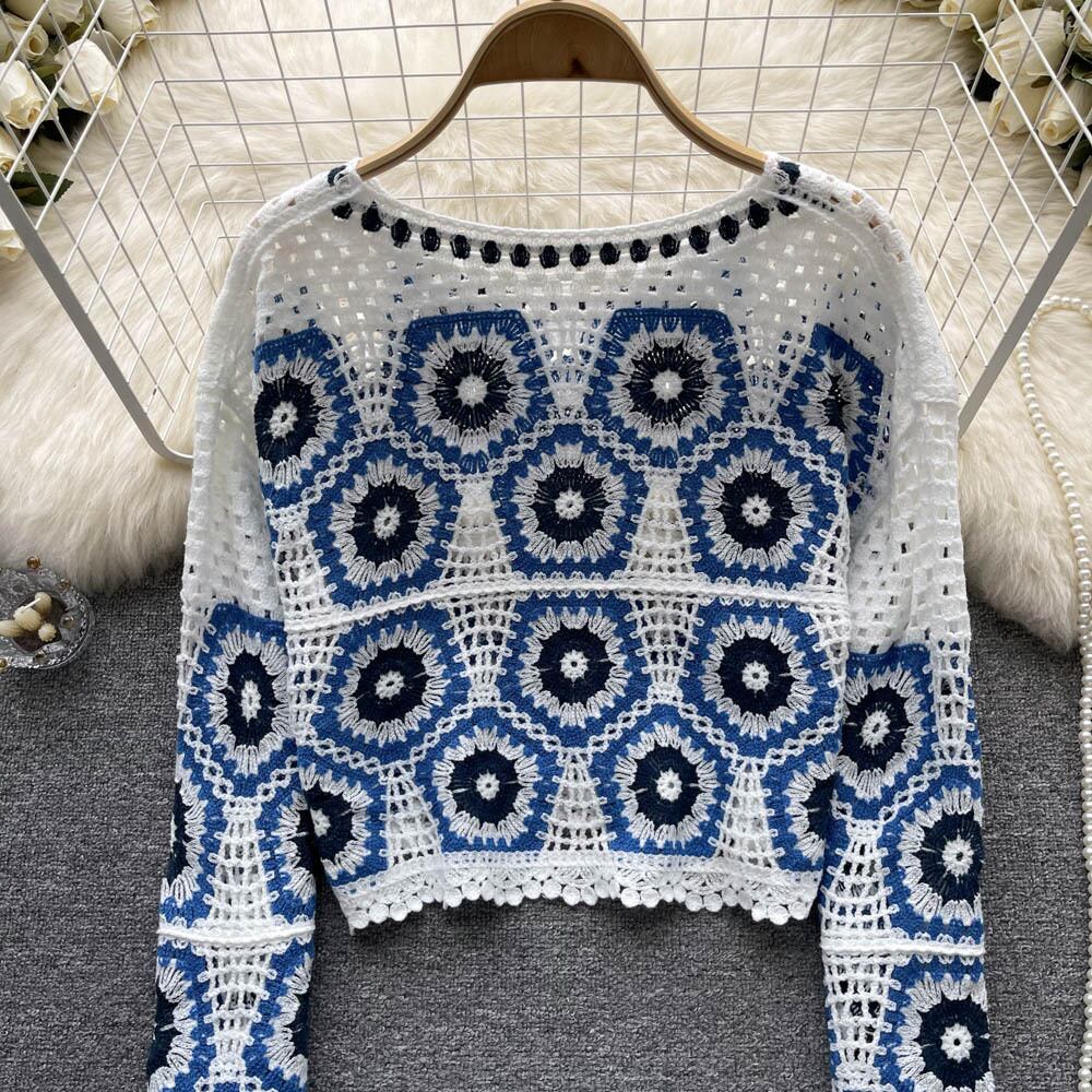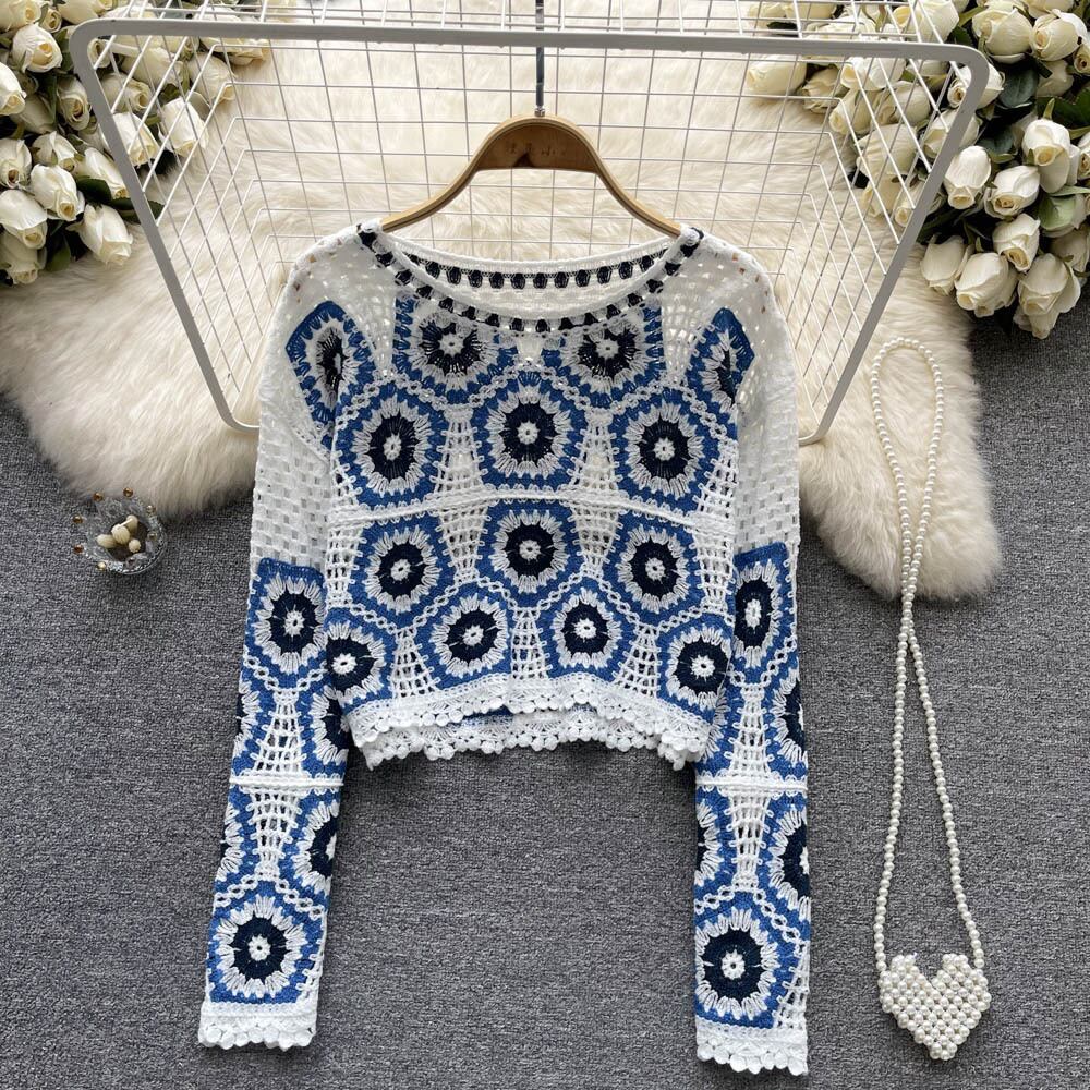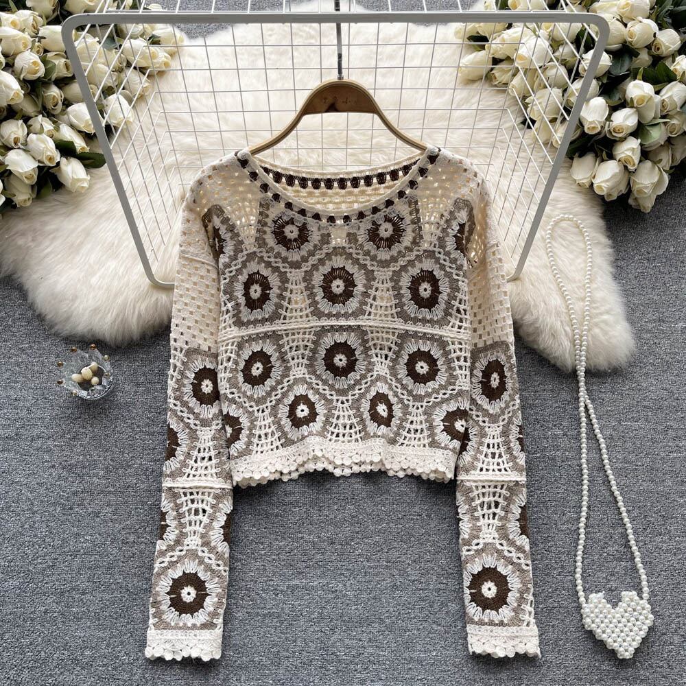 香港スタイルの怠惰なレトロなデザイン感ニッチかぎ針編み中空ラウンドネックセーター秋の女性の長袖ショートトップ ロング オータム 秋物 Oネック lyxaj92546408564