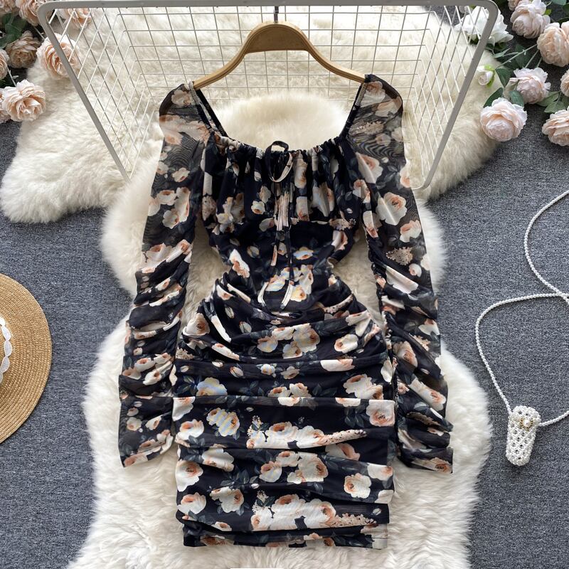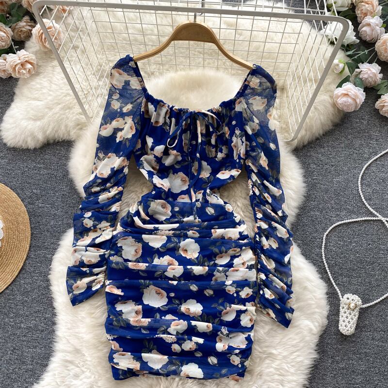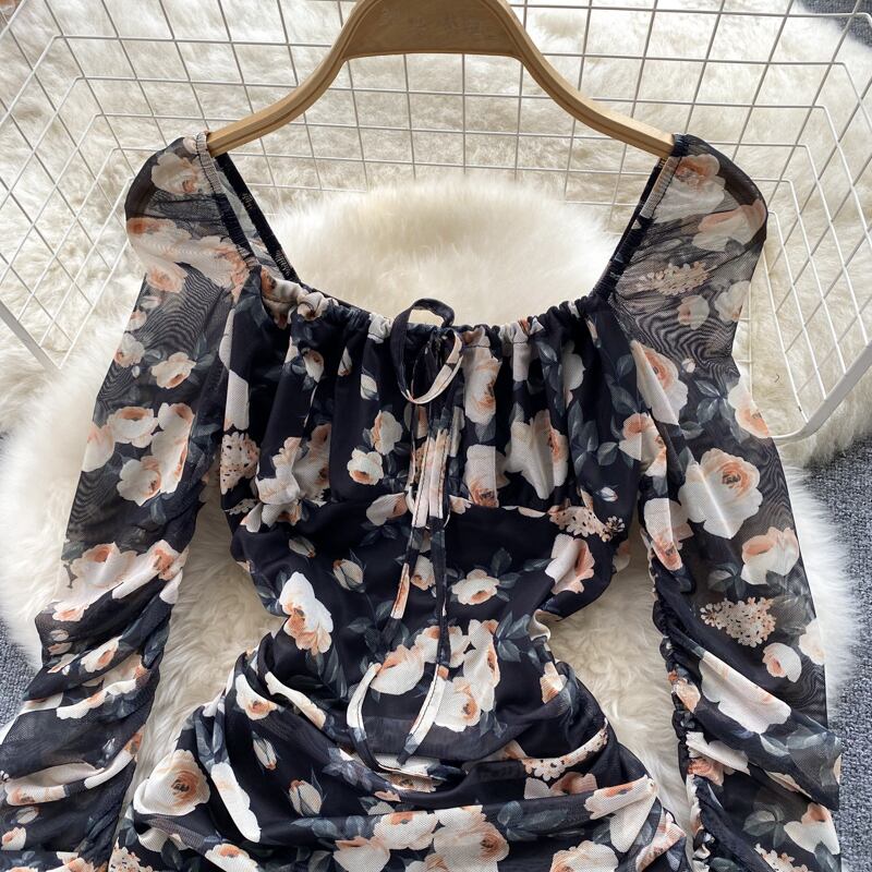 軽くて馴染みのあるスタイルのスリムな気質の長袖ドレス夏の女性のフレンチシックな見事なスクエアカラー花柄バッグヒップスカート ロング サマー 夏物 スクウェア lyxaj49220764289