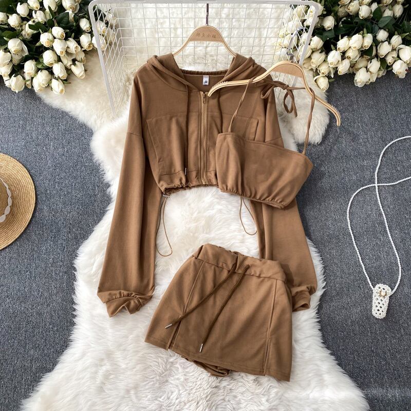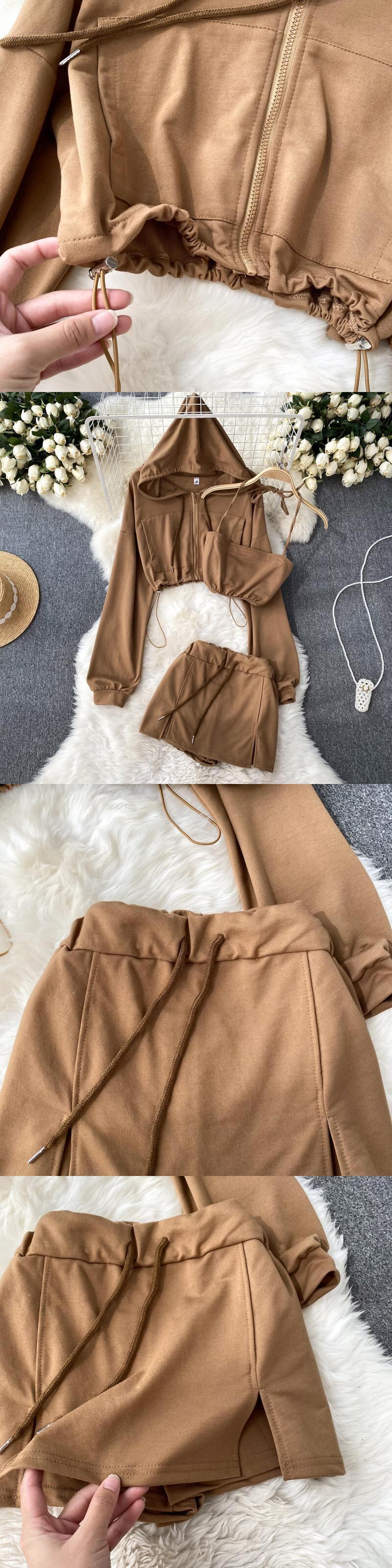 レトロカジュアルスポーツスーツ レディース フード付きジッパーカーディガン+ショートホルターストラップ+スリットスカートパンツの3点セット lyxaj14986094433