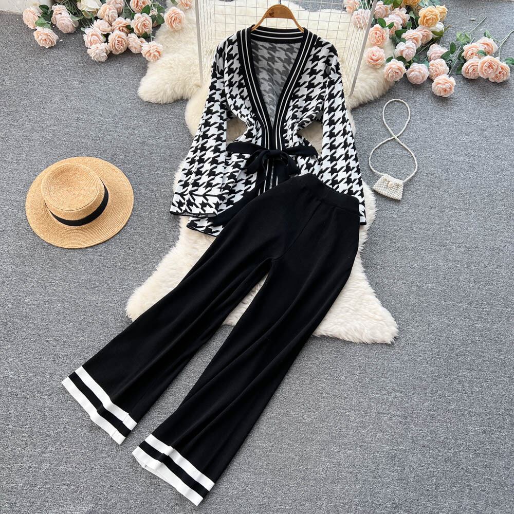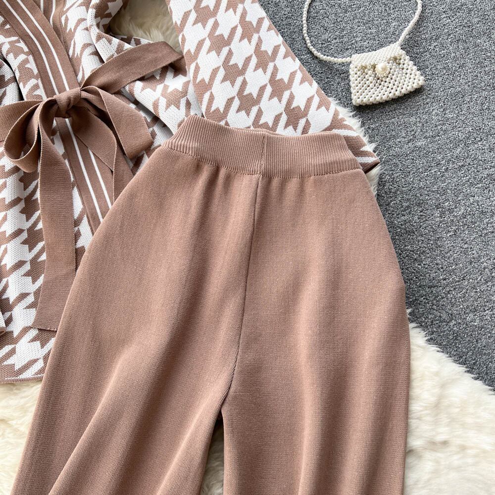 Xiaoxiangfeng ツーピース秋の婦人服千鳥格子長袖セーターカーディガンコートハイウエストドレープカジュアルロングパンツ ハイウェスト オータム 秋物 lyxaj32182927798