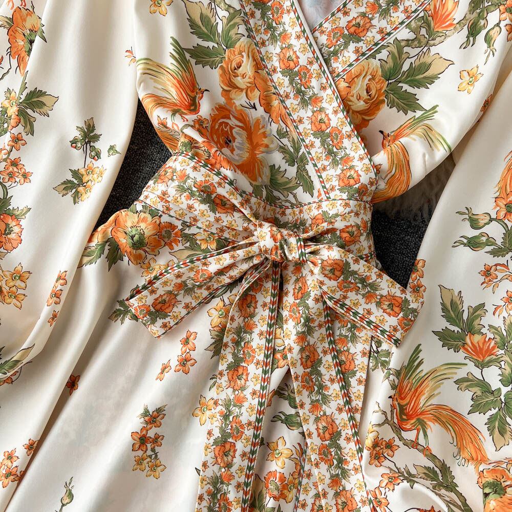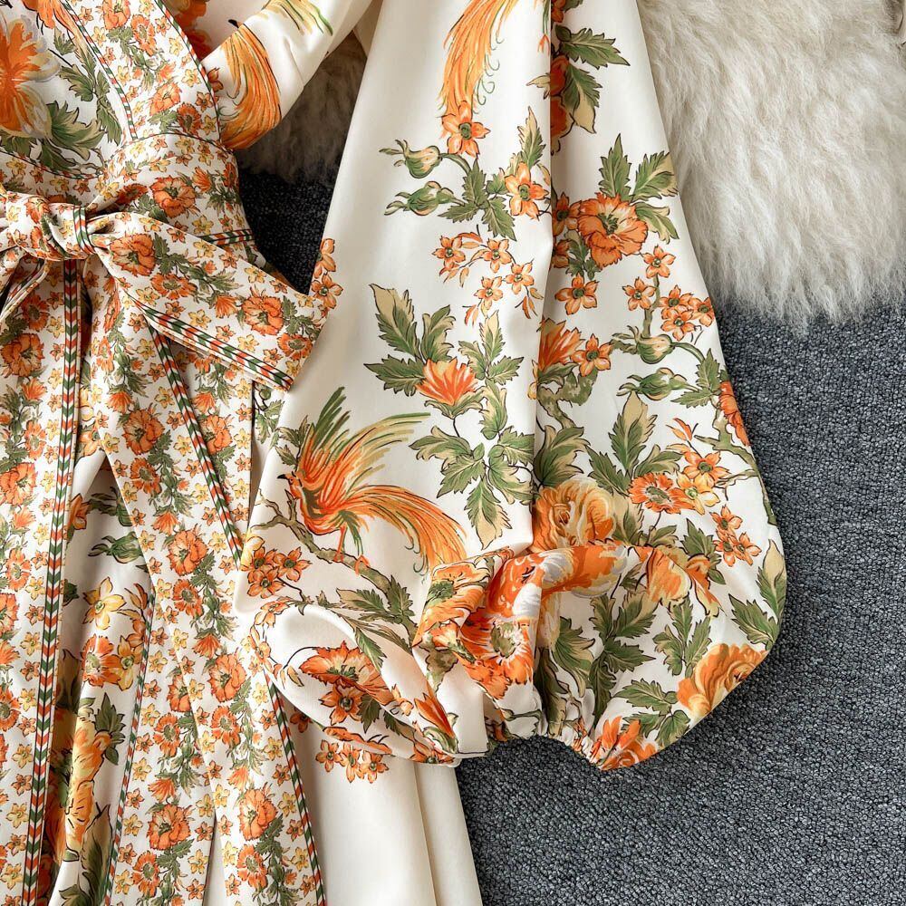 春の新作レトロVネックランタンスリーブプリントドレスレディースエスニック風蝶ネクタイタイスリットロングスカート リボン スプリング 春物 lyxaj75118708082