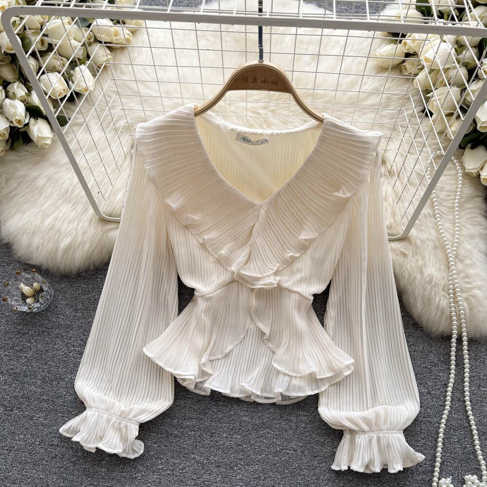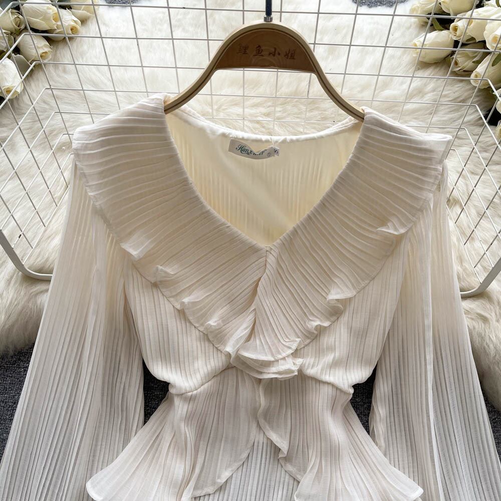 プリーツ シフォン シャツ女性の 2022 年の新しい秋の小さな香り風木製耳側有名人甘い V ネック長袖シックなトップ ロング 大人ガーリー スウィート キュート カジュアル オータム 秋物 Vネック lyxaj51860166316