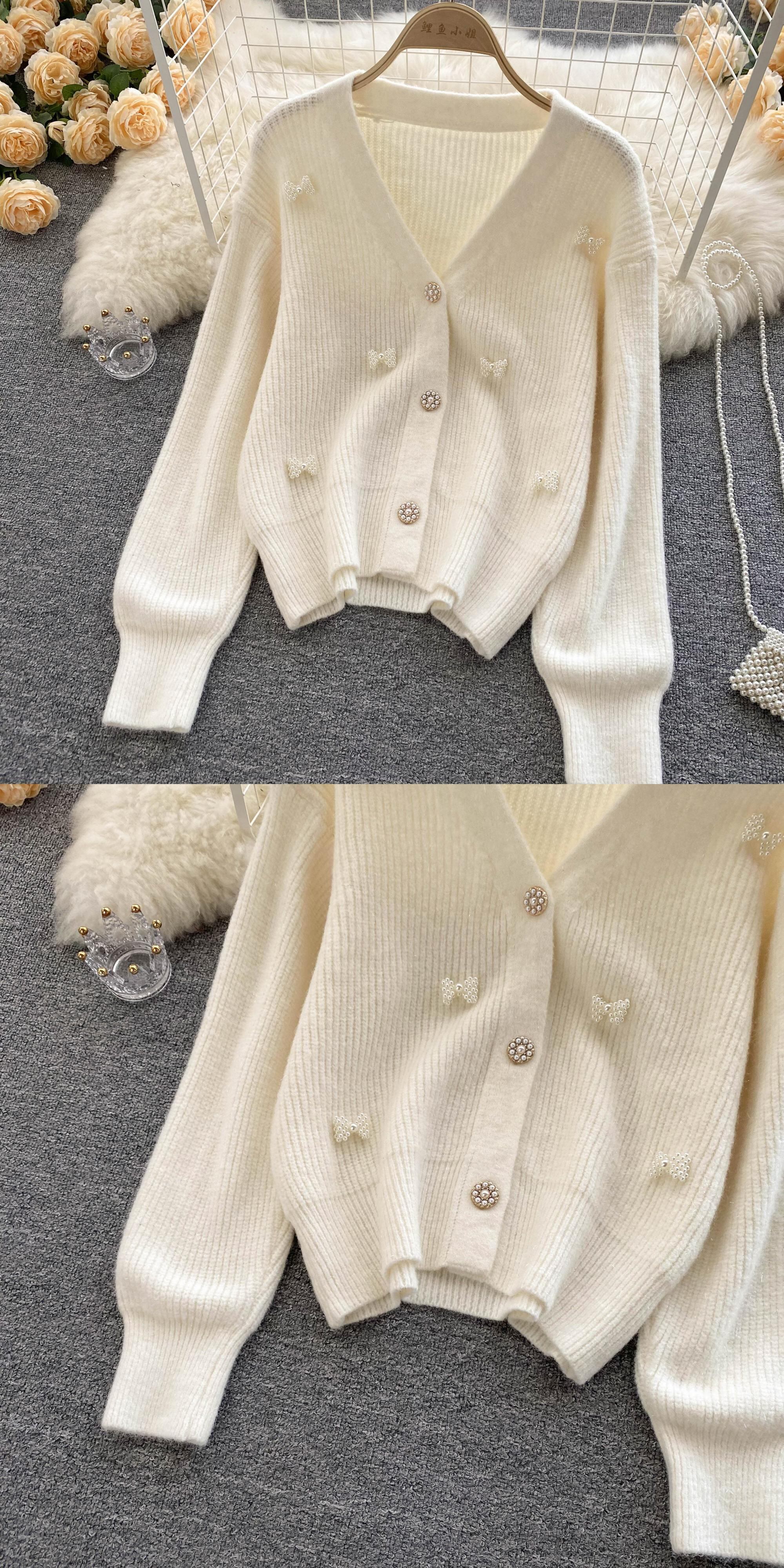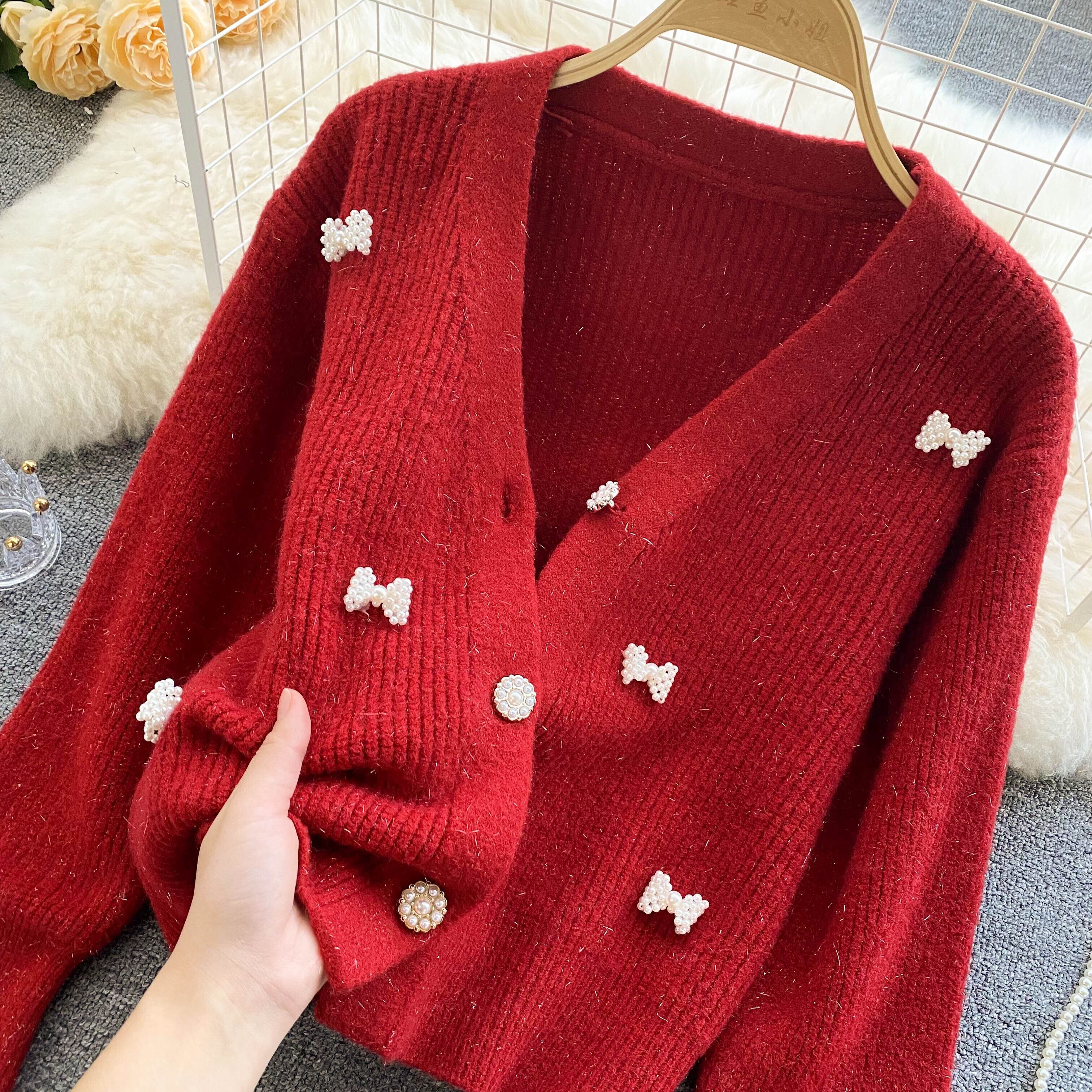 小さな新鮮なバージョンの年齢を減らす V ネック ニット カーディガン緩い怠惰な風立体弓ショート セーター ジャケット女性 リボン Vネック lyxaj42928603348