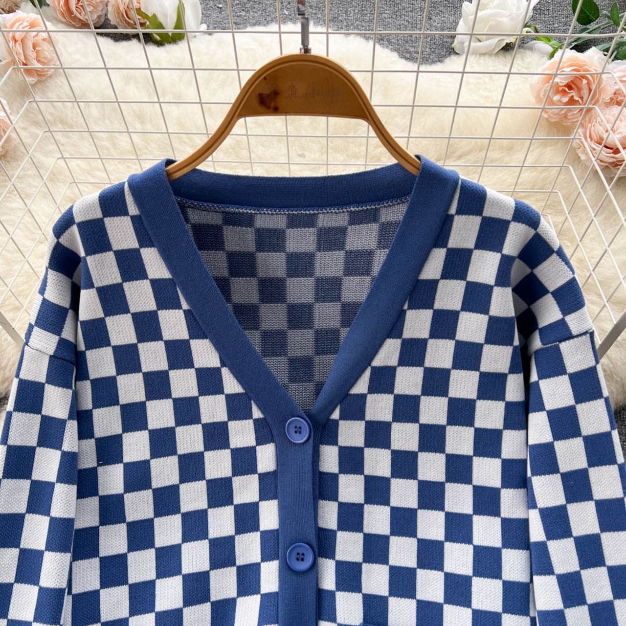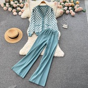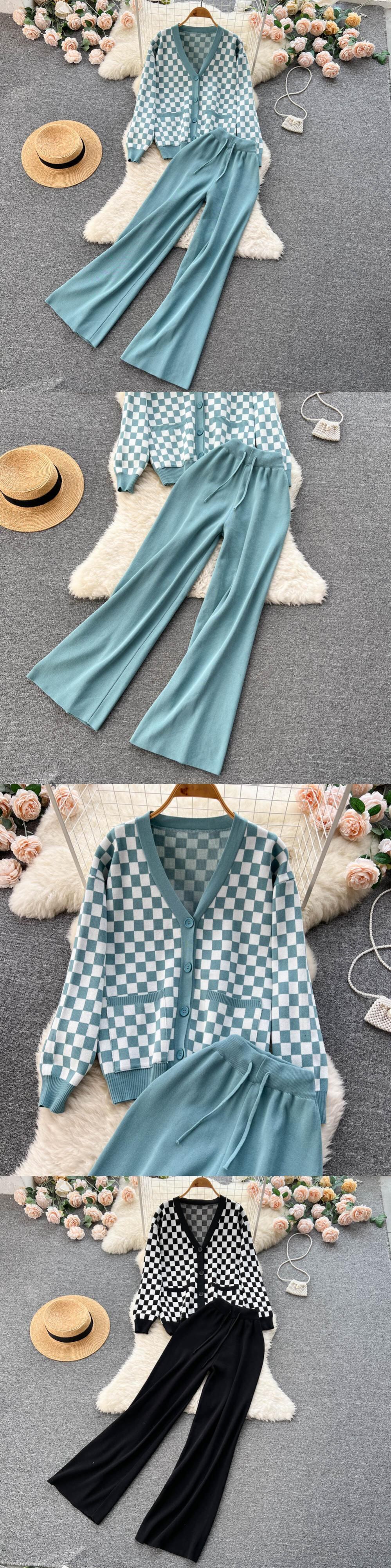 コントラストカラー小香風ニットスーツ レディース チェック柄Vネックカーディガン セータージャケット+ワイドレッグロングパンツ レディースツーピースセット lyxaj2036389507