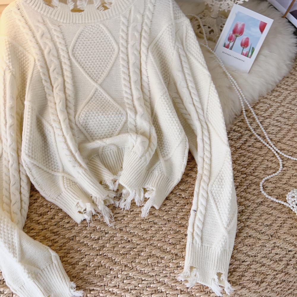 秋と冬の新しいデザイン センス怠惰なスタイル生エッジ ツイスト ロンバス ニット セーター女性の短いスタイル ホール シックなセーター ショート オータム 秋物 ウィンター 冬物 lyxaj25307520215