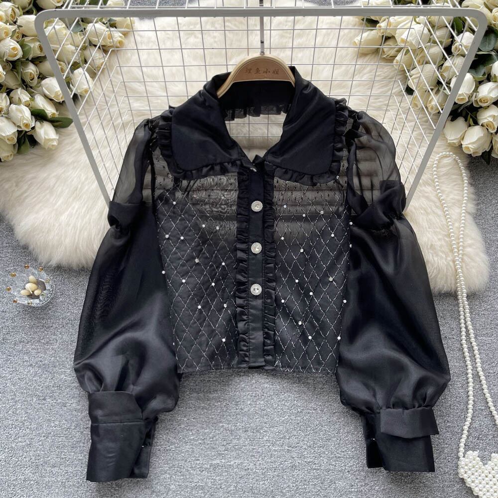 2022 秋の新フレンチライト高級ビーズラペル長袖シャツ女性のハイエンド気質ショートスウィートトップ ロング 大人ガーリー キュート カジュアル オータム 秋物 lyxaj82996547785