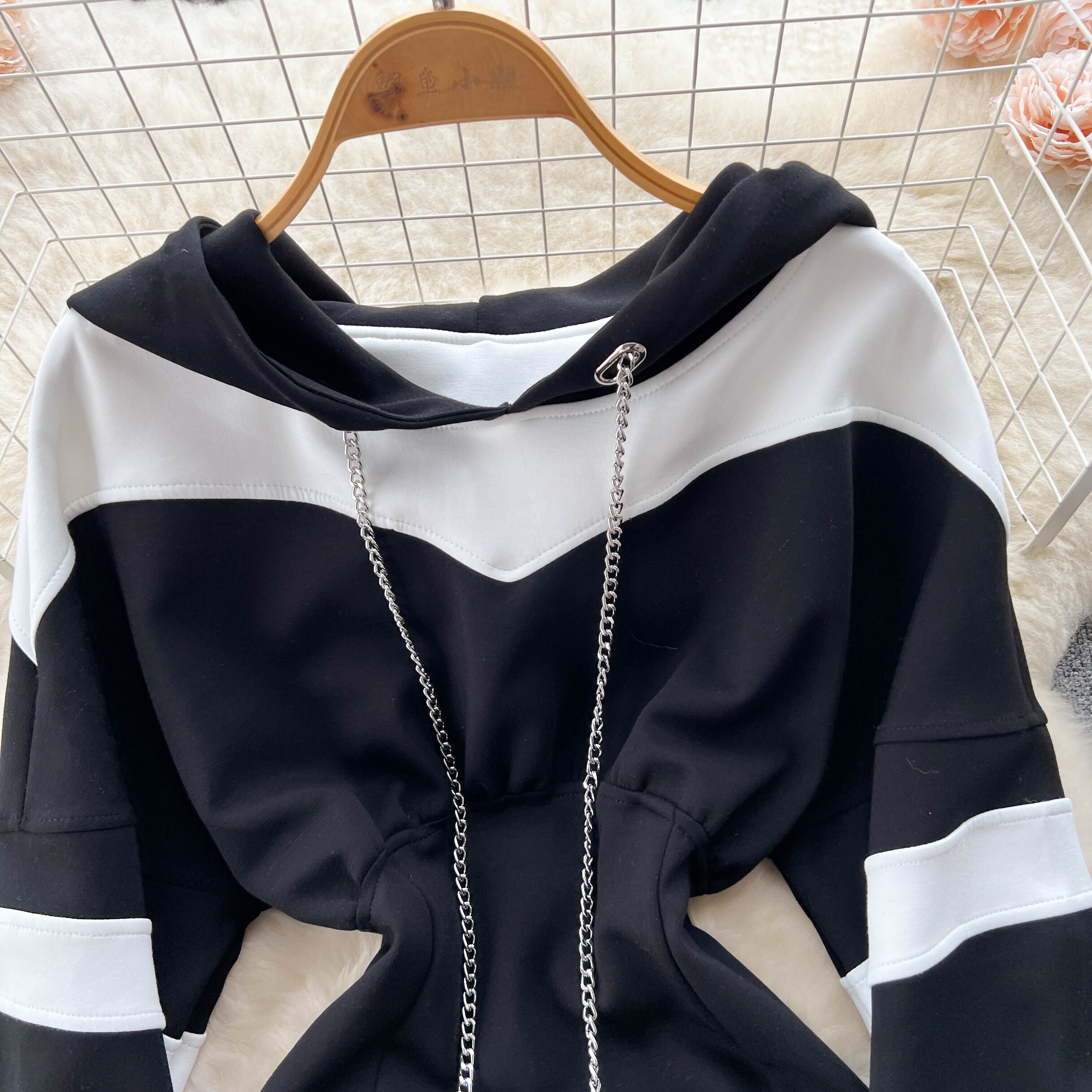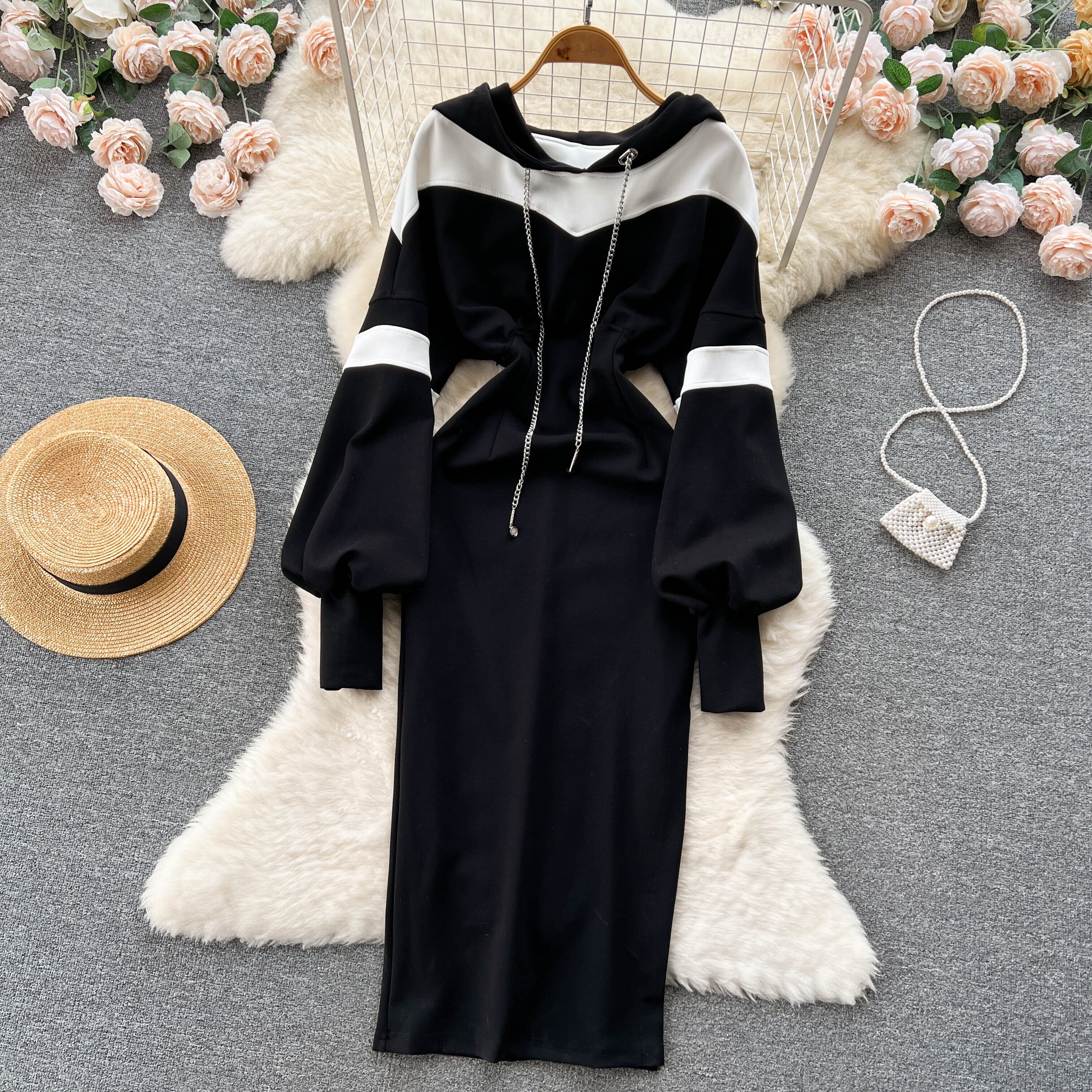 2022 秋と冬の新ファッション気質カラーコントラストステッチフード付きウエストドレスセーターバッグヒップドレス女性のファッション オータム 秋物 ウィンター 冬物 lyxaj84303918025