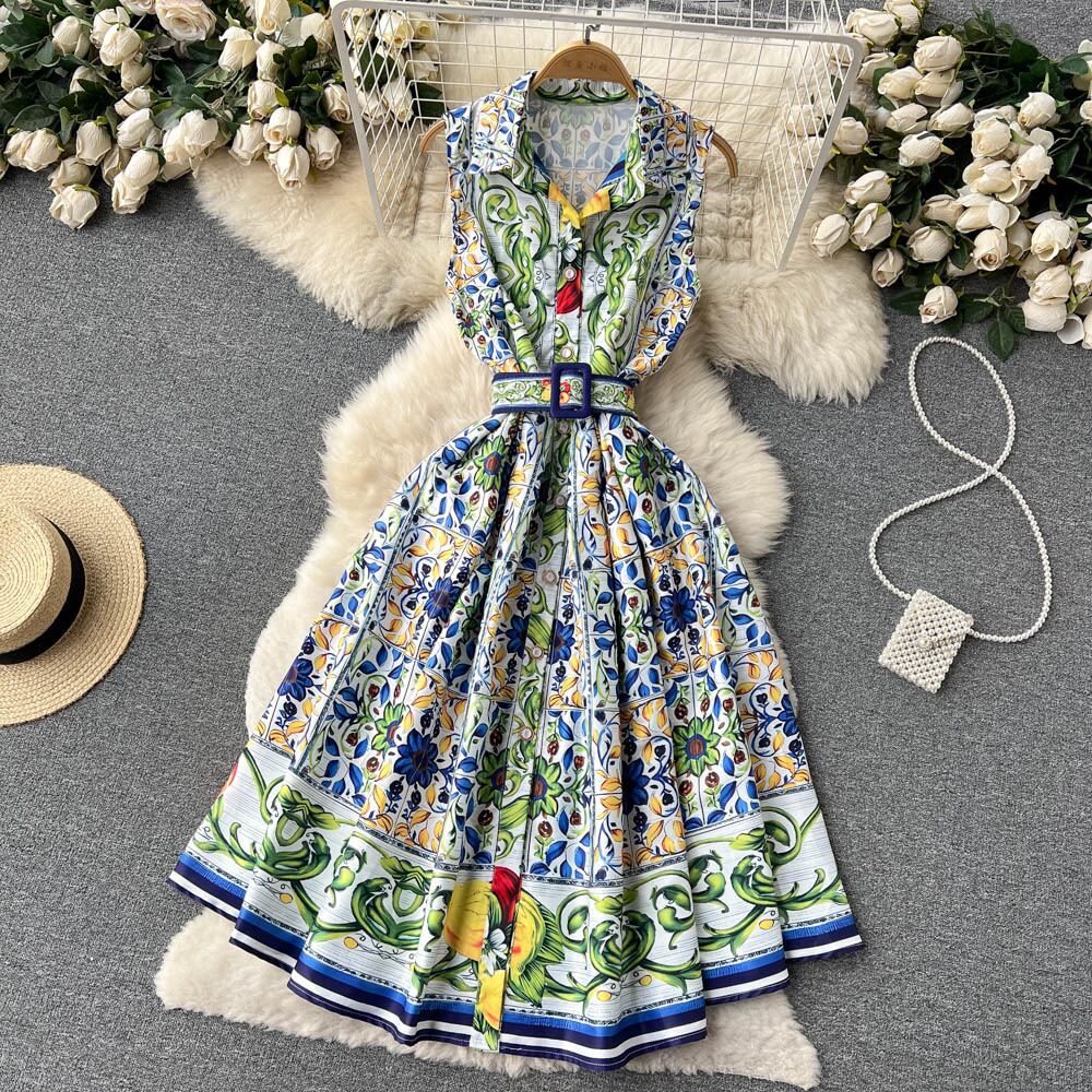 春夏新作 コートスタイル ノースリーブ ラペル ウエスト痩せ 欧米風 欧米風 プリント ミドル丈 ワンピース トレンド スプリング 春物 サマー 夏物 ヨーロピアン lyxaj69157520566