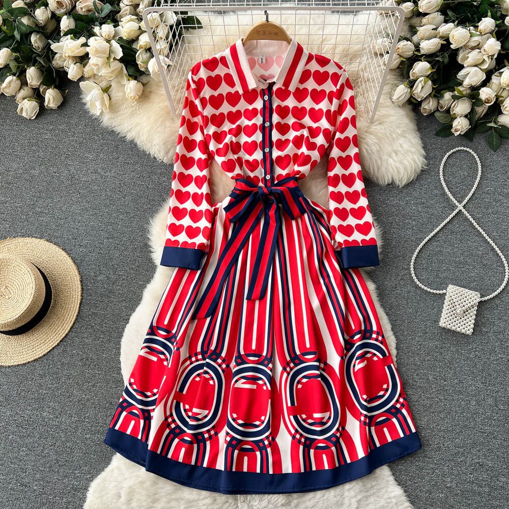 ヨーロッパとアメリカのインスタイルの春と秋のファッションオールマッチスリムウエストプリントドレスレディースラペルロングスリーブAラインスカートタイド スプリング 春物 オータム 秋物 ヨーロピアン lyxaj5184254604