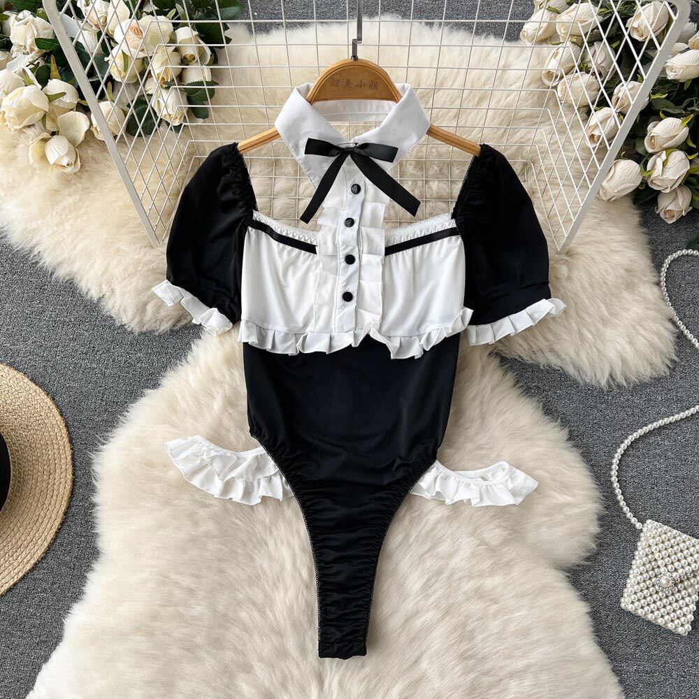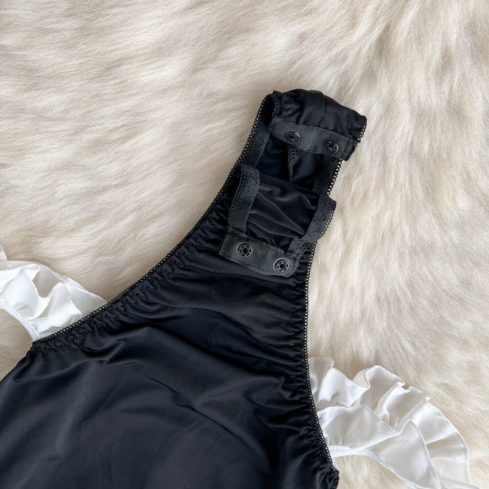 純粋な欲望ニッチなデザインセンスフリルコントラストカラー吊りネック中空パフスリーブジャンプスーツ夏の女性の底入れ下着 ラッフル サマー 夏物 lyxaj93565532835