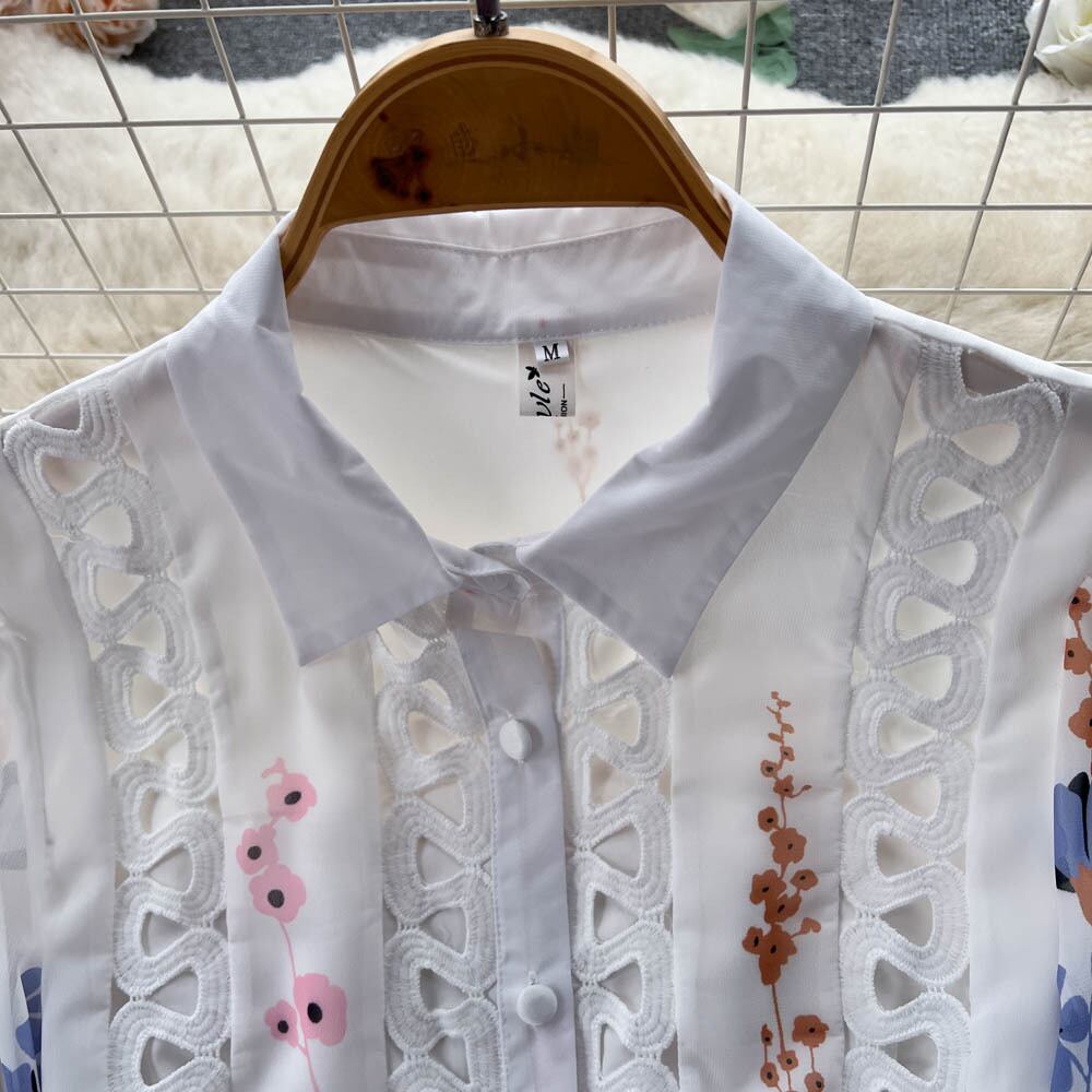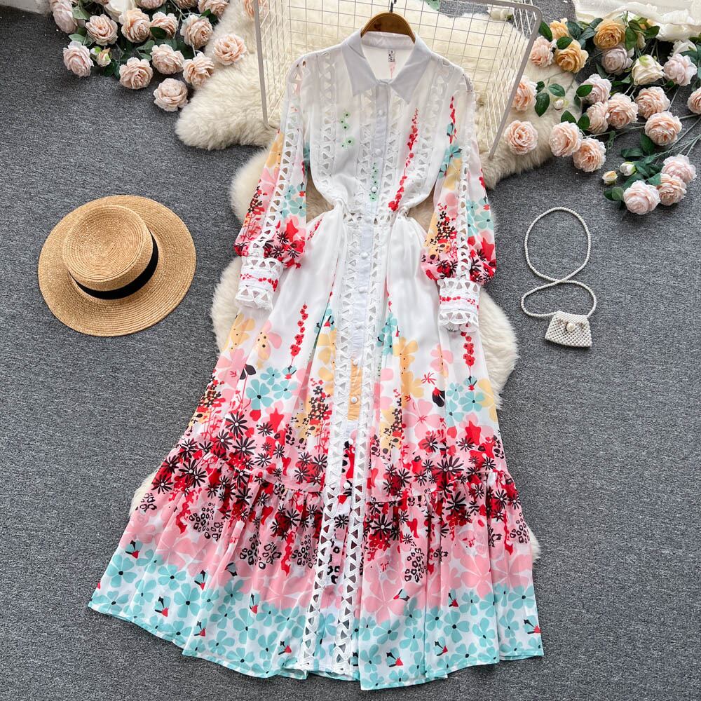 春秋ボヘミアンフリルシングルブレストレースレース中空ポロカラーシャツプリントドレスロングスカート スプリング 春物 オータム 秋物 lyxaj46805324043
