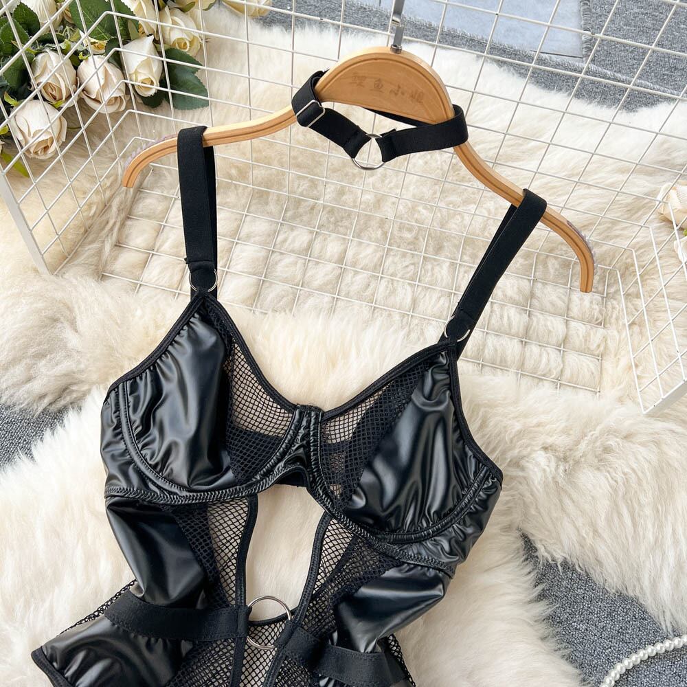 夏の偏心ブロック純粋な欲望セクシーなレースメッシュスプライシング PU レザー中空高 k スリングジャンプスーツトレンディ サマー 夏物 ピュア lyxaj82151487798