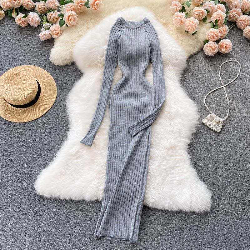 秋 2022 女神ファン気質ラウンドネックセクシーなウエストヒップ弾性明るいシルクニットドレス エラスティック 伸縮 オータム 秋物 Oネック lyxaj23450896370