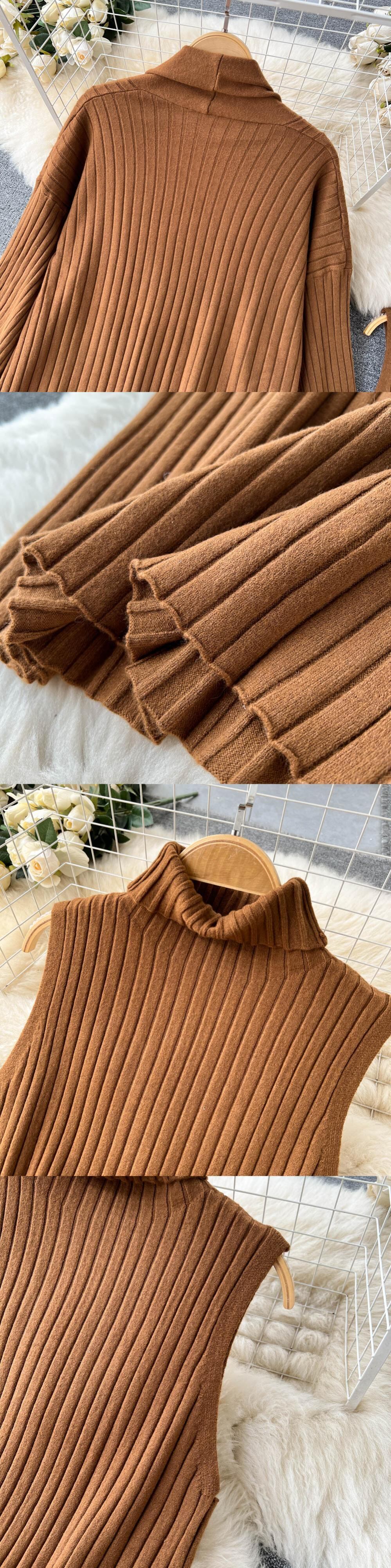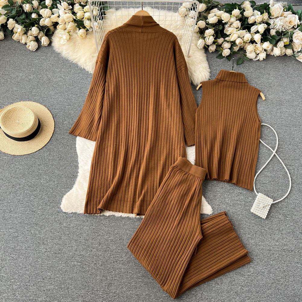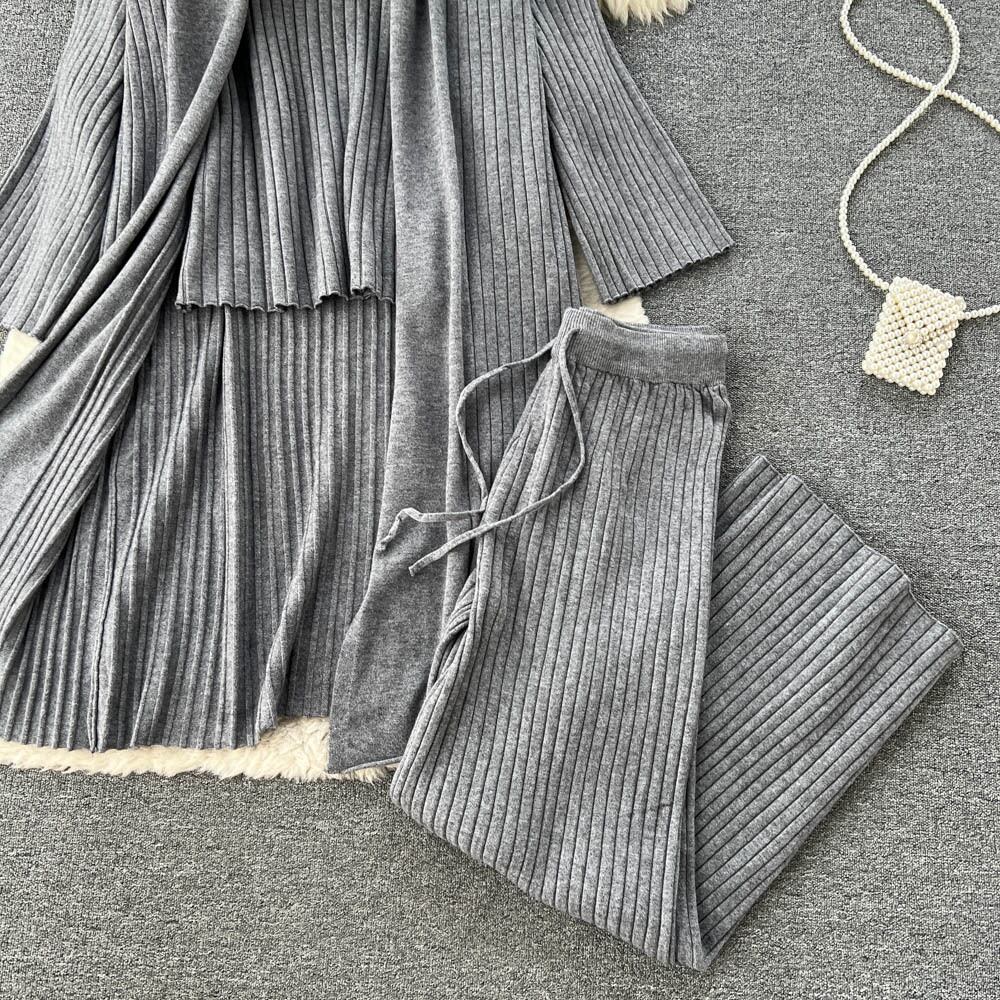 レイジースタイル ニットスーツ レディース ロングショールカーディガンジャケット+ハイカラーノースリーブベスト+ワイドパンツの3点セット ワイドレッグ lyxaj32696619891