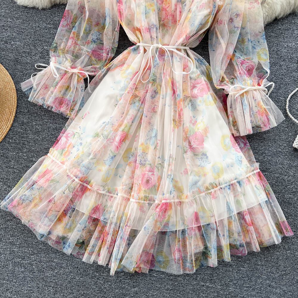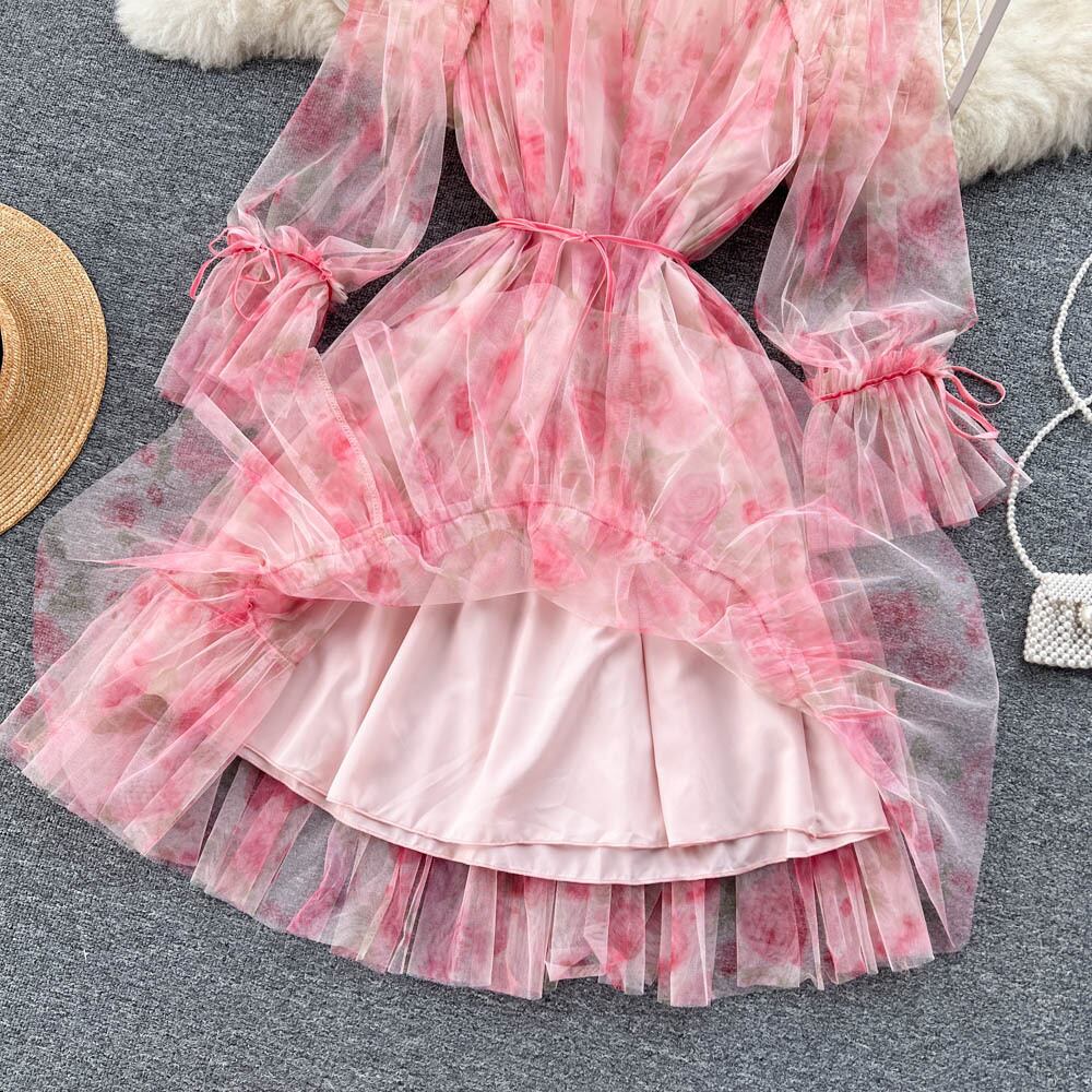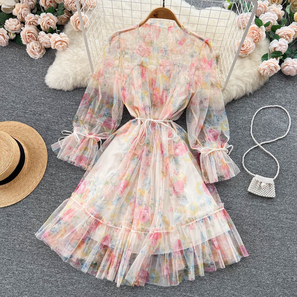 フランスの甘いニッチ デザイン ウエスト ベル スリーブ ドレス スカート秋の婦人服小さな メッシュ プリンセス スカート潮 ベルスリーブ 大人ガーリー スウィート キュート カジュアル オータム 秋物 lyxaj9751215987