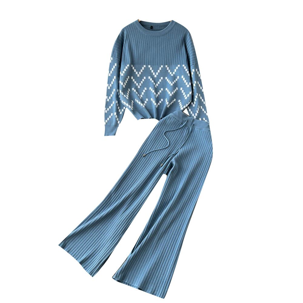 秋と冬の小さなフレグランススーツ女性のラウンドネックルーズプリントセーター+巾着タイドレープワイドレッグパンツ2点セット オータム 秋物 ウィンター 冬物 Oネック lyxaj62326351033
