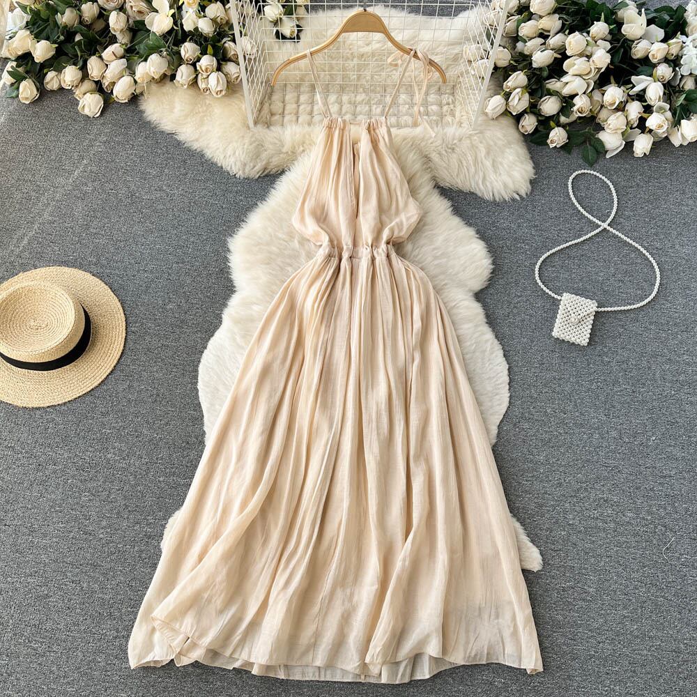 夏の新デザイン圧力プリーツ ホルター ネック ストラップ ドレス女性ウエスト セクシーなシフォン有名人妖精ロング スカート サマー 夏物 lyxaj57987768827