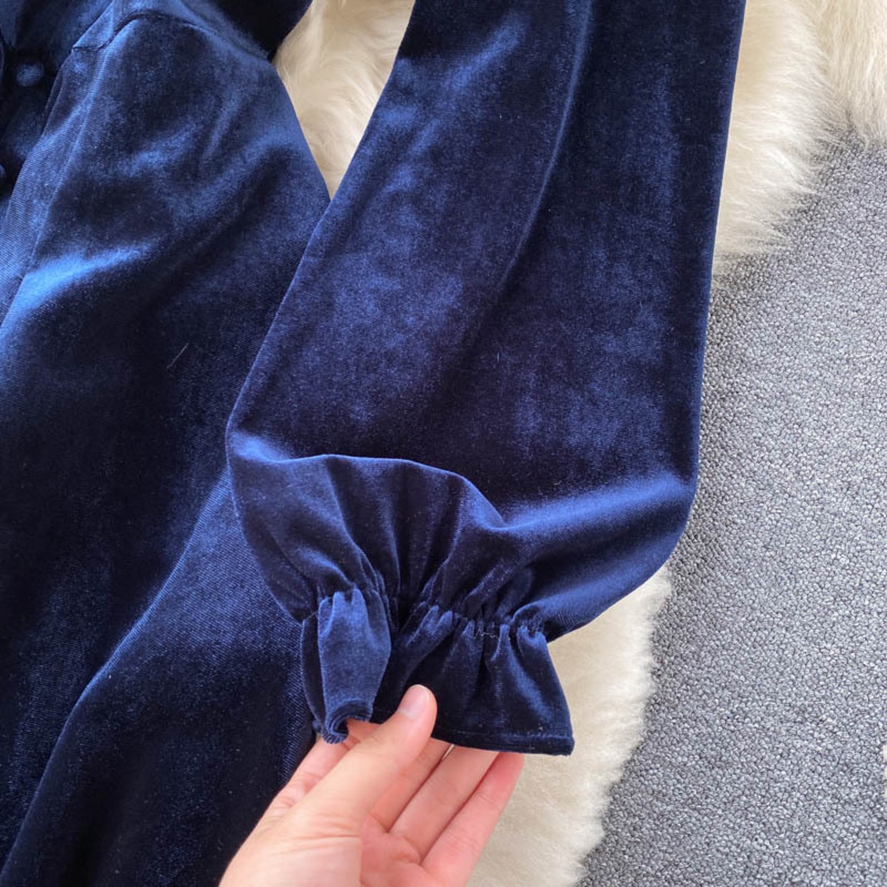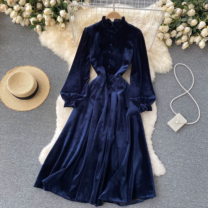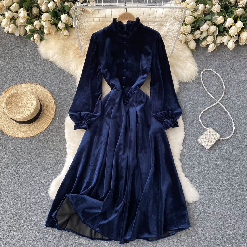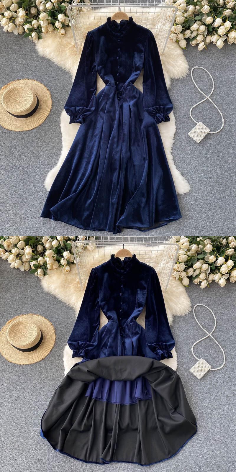 Yujie ライト調理風ランタンスリーブベルベットドレス秋の女性のドレスフランスのレトロなウエスト痩身プリーツドレス オータム 秋物 lyxaj81716652288