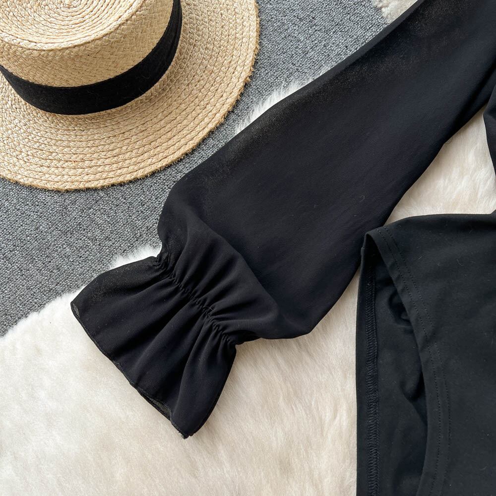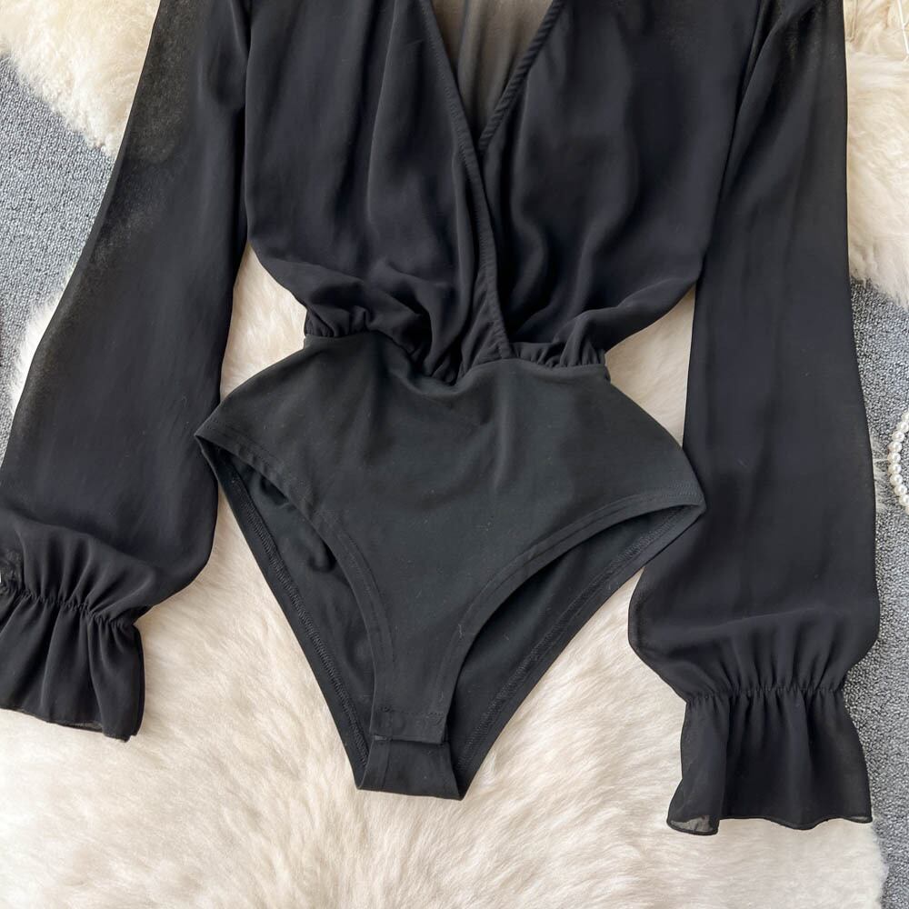 春秋新作 プルオーバー トランペットスリーブ 深いVネック 黒 純情風 ウエスト スリム ハイK ジャンプスーツ 潮 ブラック スプリング 春物 オータム 秋物 ピュア lyxaj26078773606