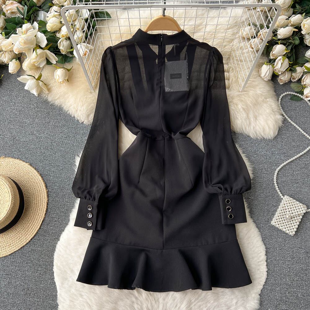春と秋のセレブの気質ランタンスリーブフリルドレスフェミニンなボトムスミッドレングスの不規則なマーメイドスカート スプリング 春物 オータム 秋物 lyxaj5259434507
