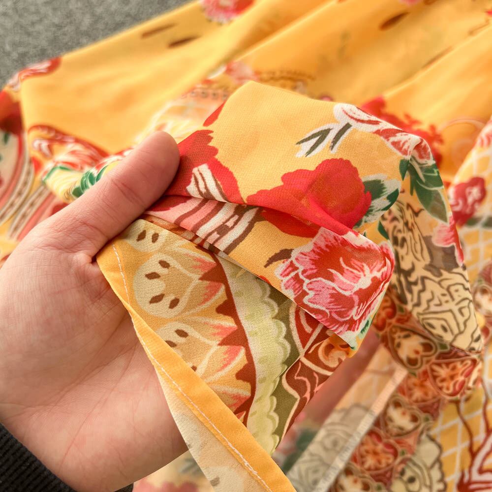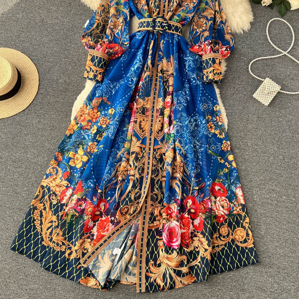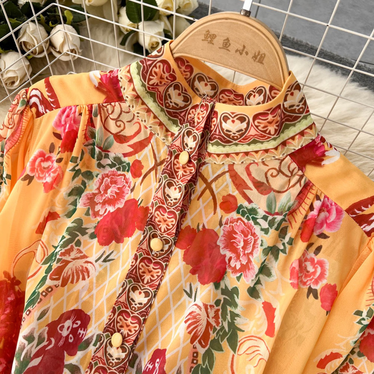 春の新デザインセンスフレンチレトロスタンドカラーパフスリーブプリントワンピース女性エスニック風ビッグスイングロングスカート スプリング 春物 lyxaj83184134199