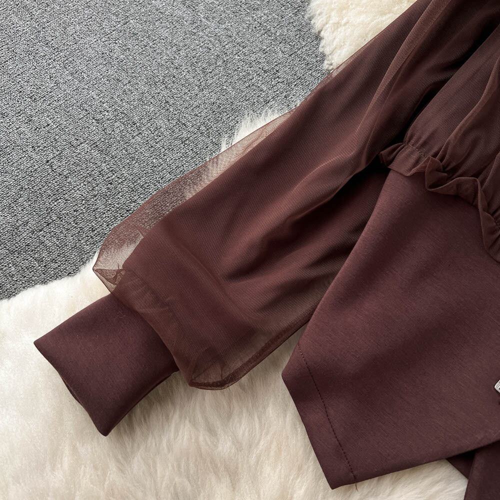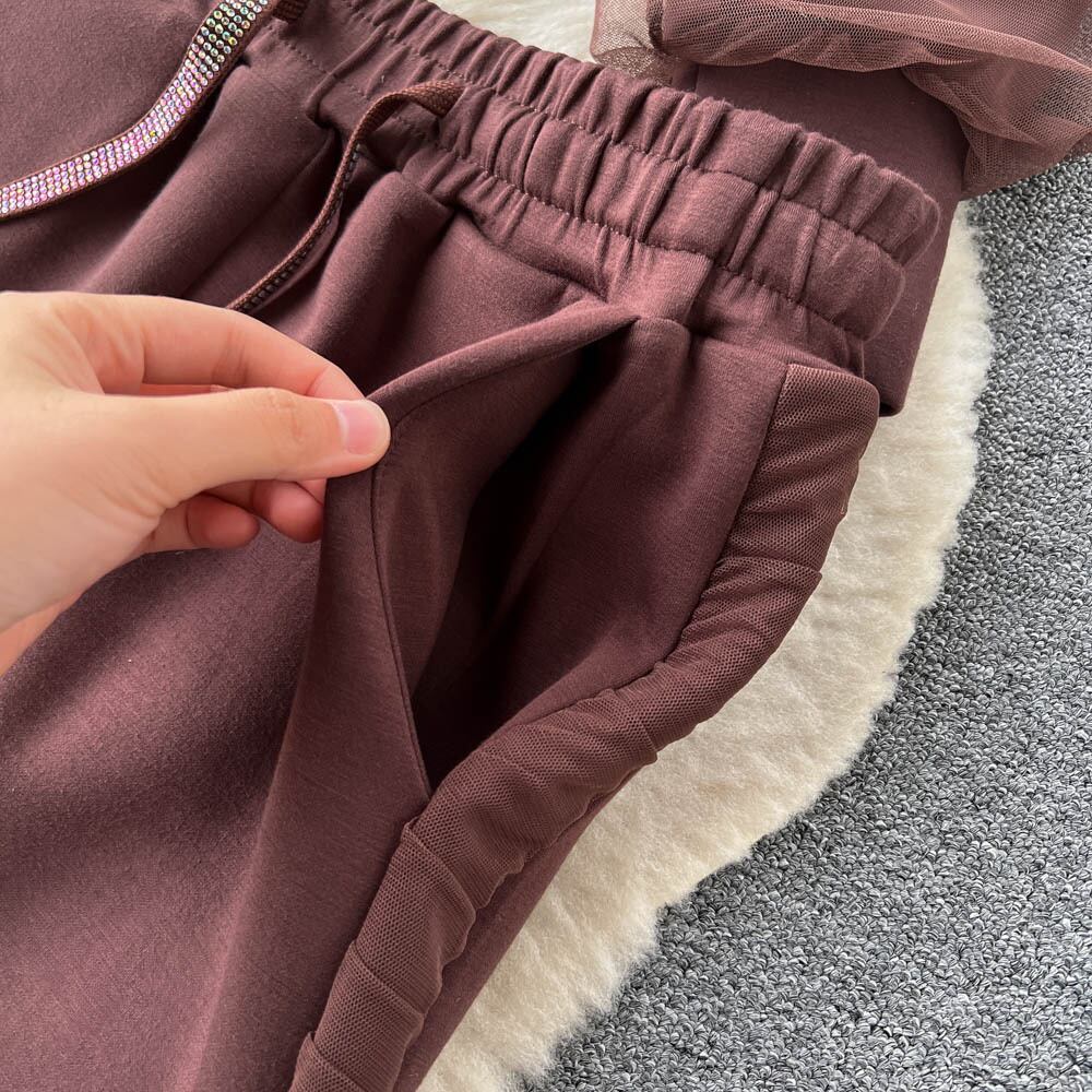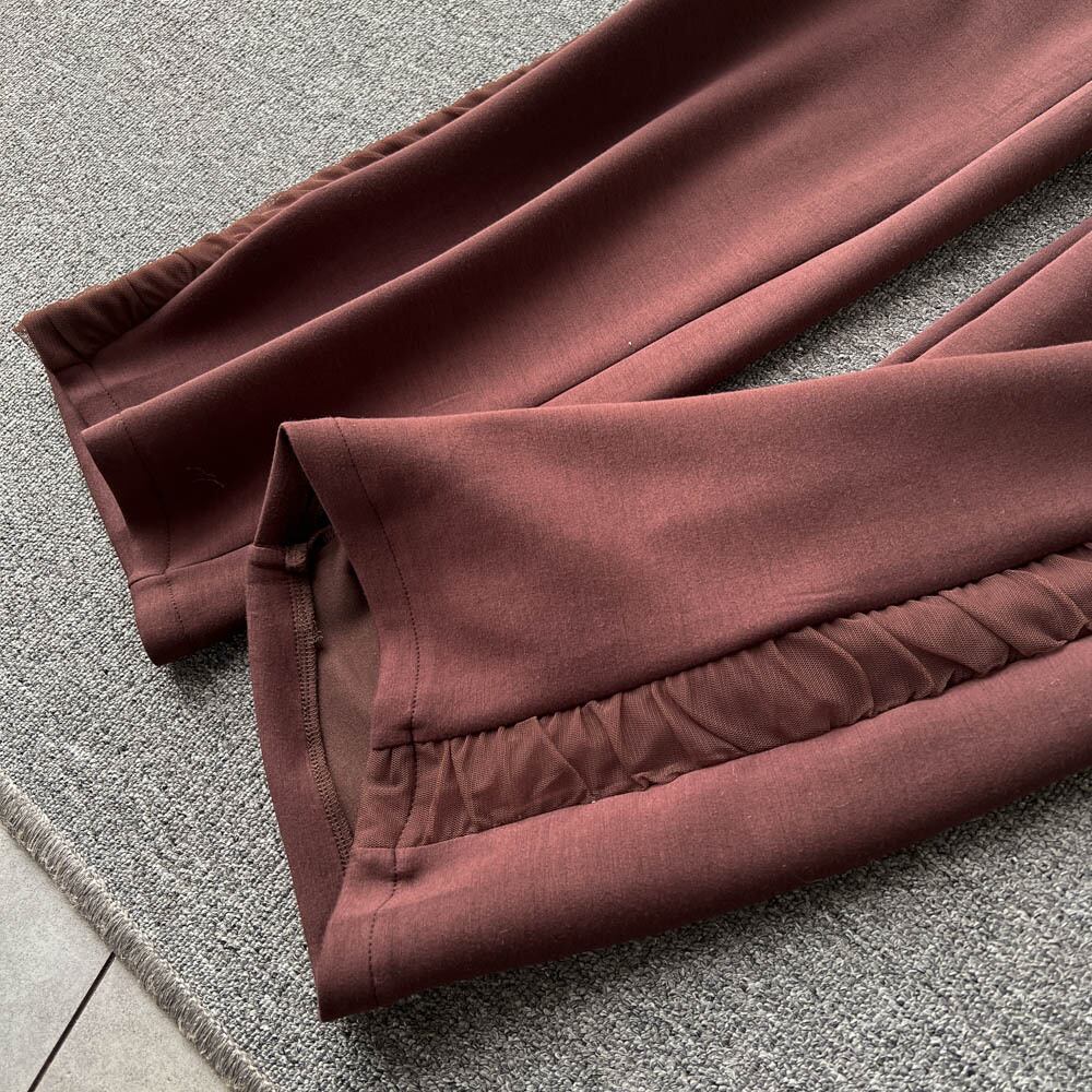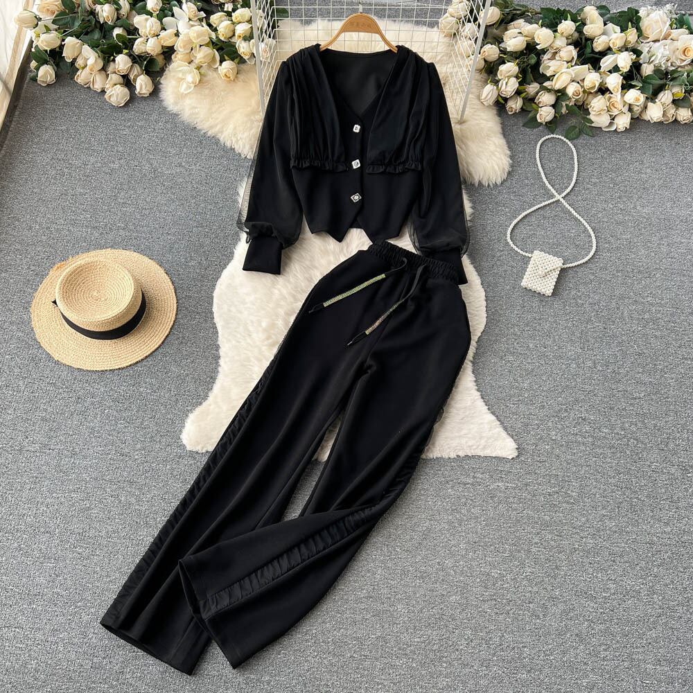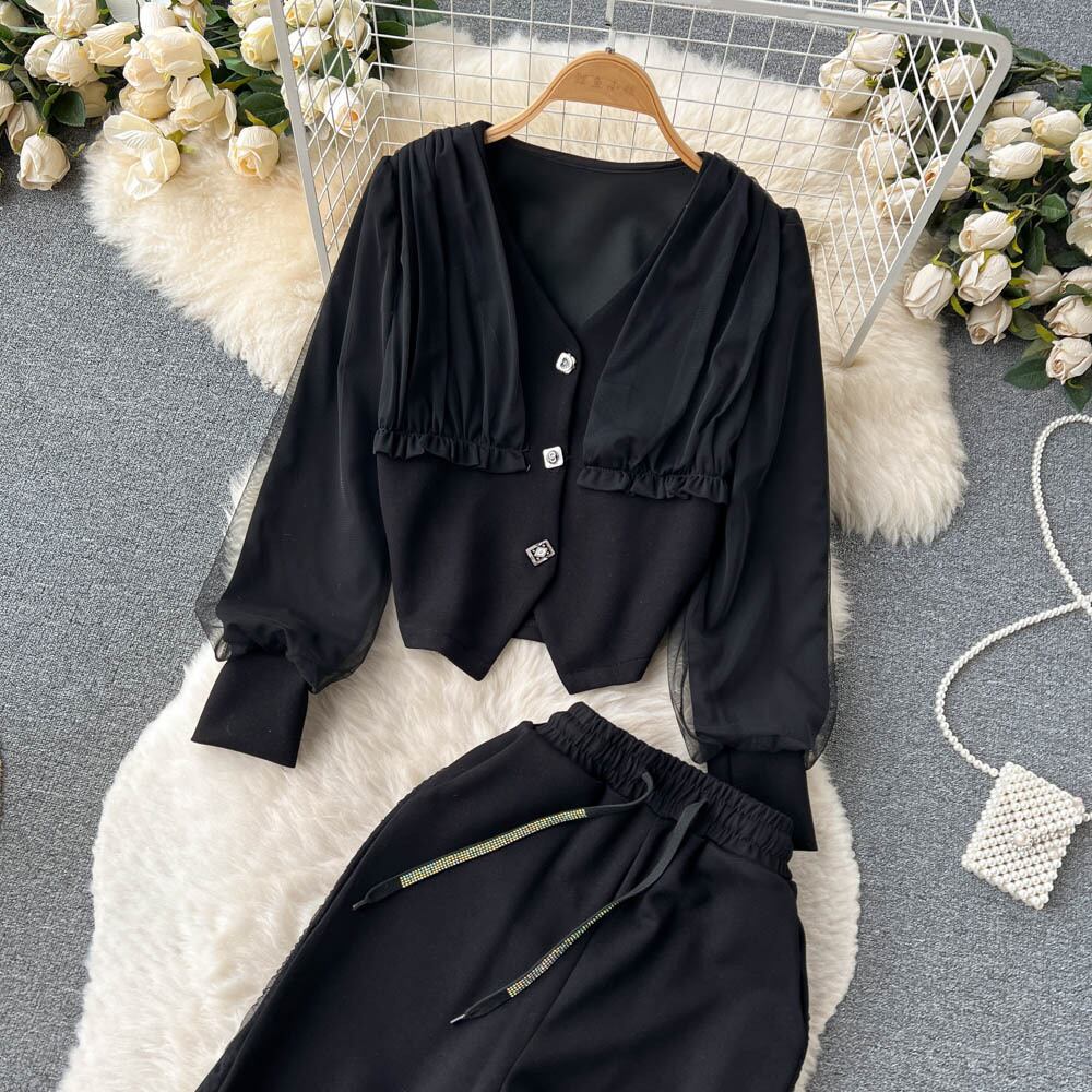 Vネックショートシングルブレストメッシュトップ+ステッチプラスルーズカジュアルモップワイドレッグスーツパンツツーピーススーツ秋 オータム 秋物 lyxaj32582744890