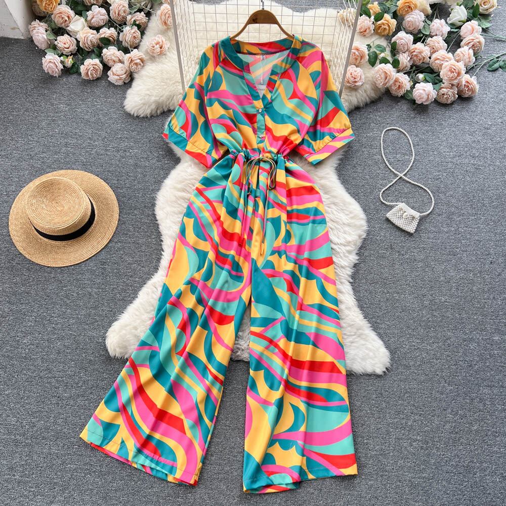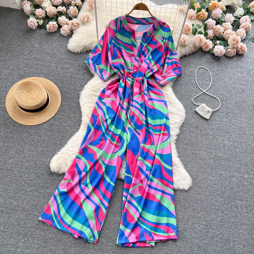 夏のドレスの新しいヨーロッパとアメリカのイン休日風ウエスト プリント半袖ジャンプ スーツ女性ストレート ルーズ ワイドレッグ ジャンプ スーツ サマー 夏物 ヨーロピアン lyxaj10992519684
