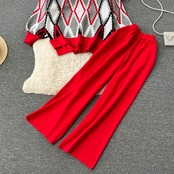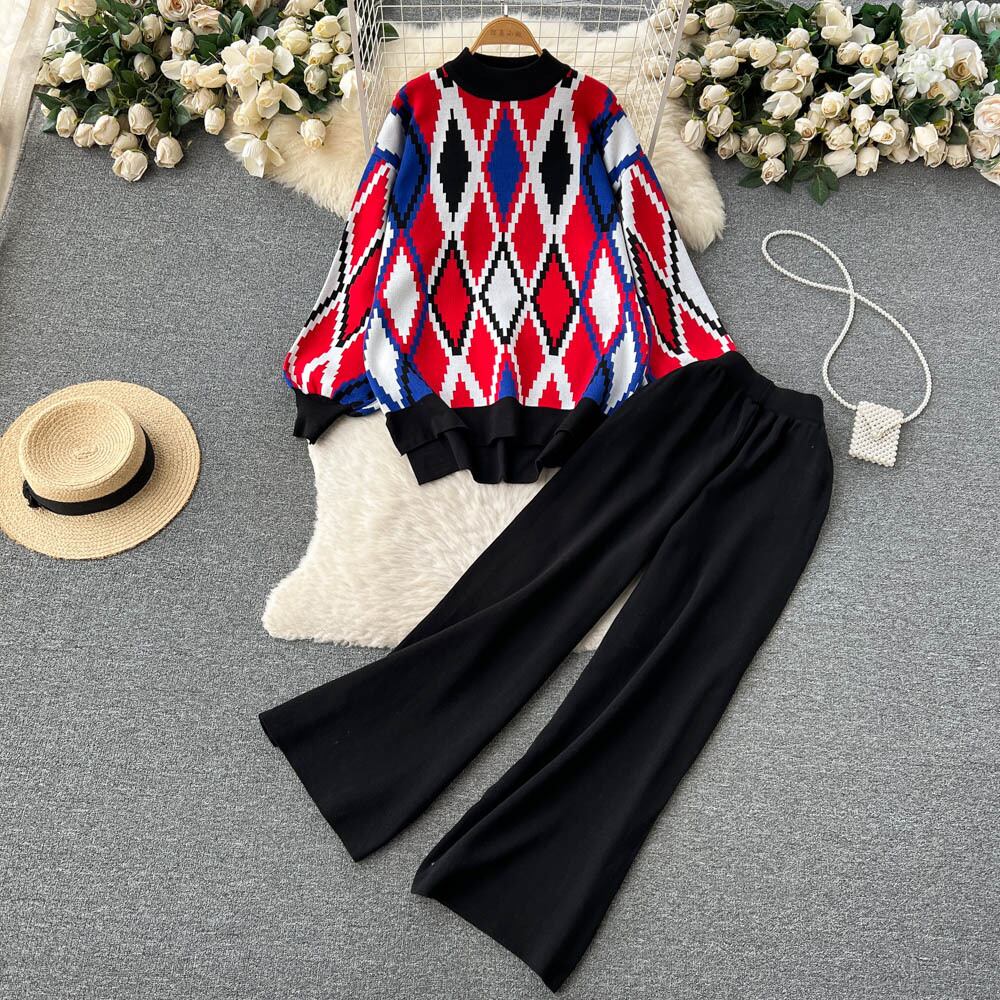 秋冬フレンチレトロスタイルニットスーツレディースコントラストカラーダイヤモンドセーター+ドレープカジュアルワイドパンツツーピースセット オータム 秋物 ウィンター 冬物 lyxaj39195744038