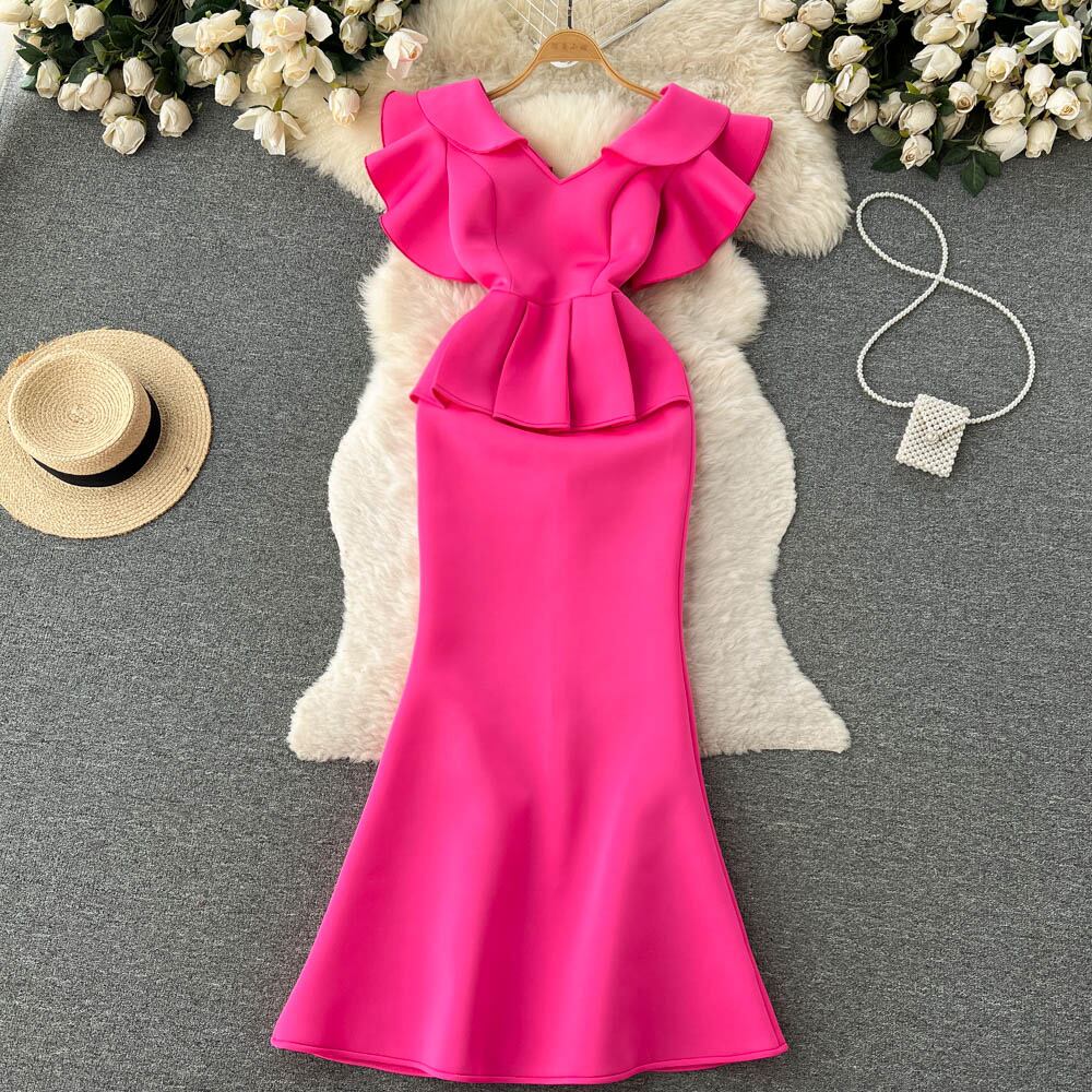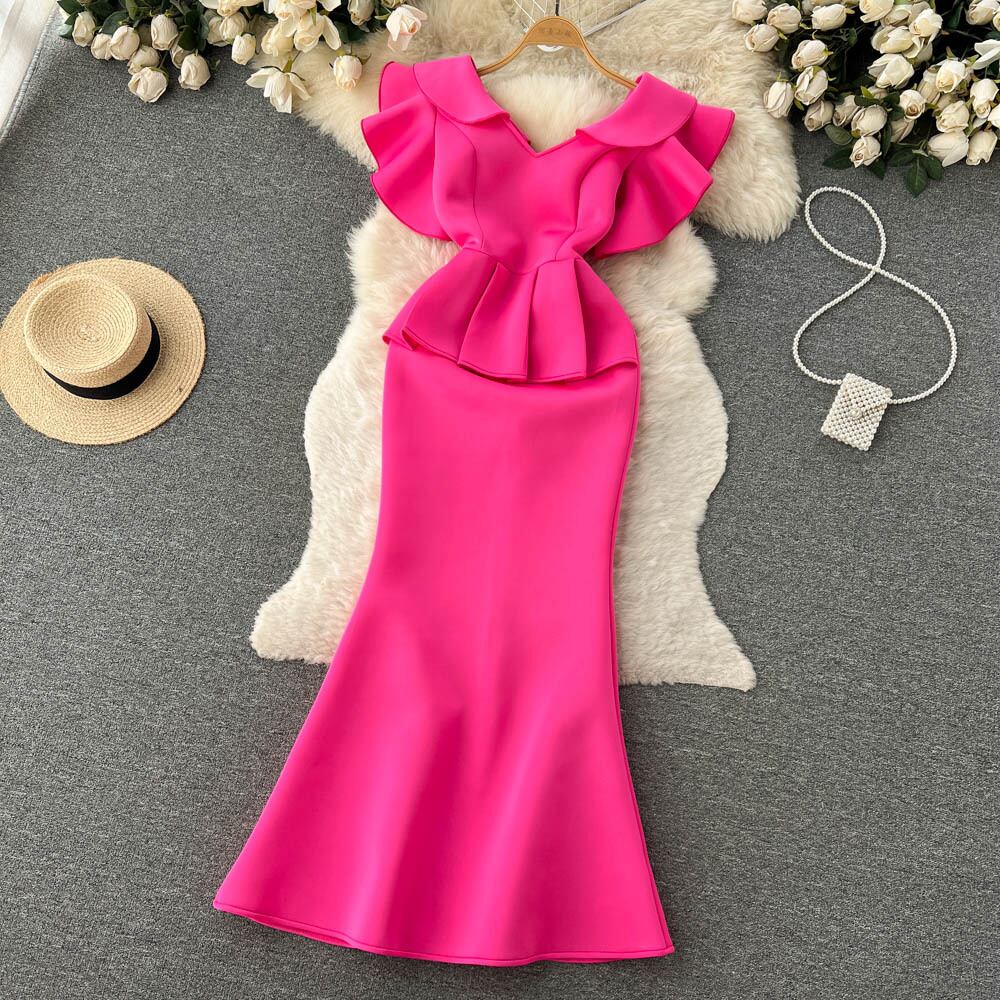 春と夏のセクシーな V ネック フリル袖のドレスの女性のバージョン バッグ ヒップ ウエスト気質セレブ マーメイド ロング スカート スプリング 春物 サマー 夏物 Vネック lyxaj64763261401